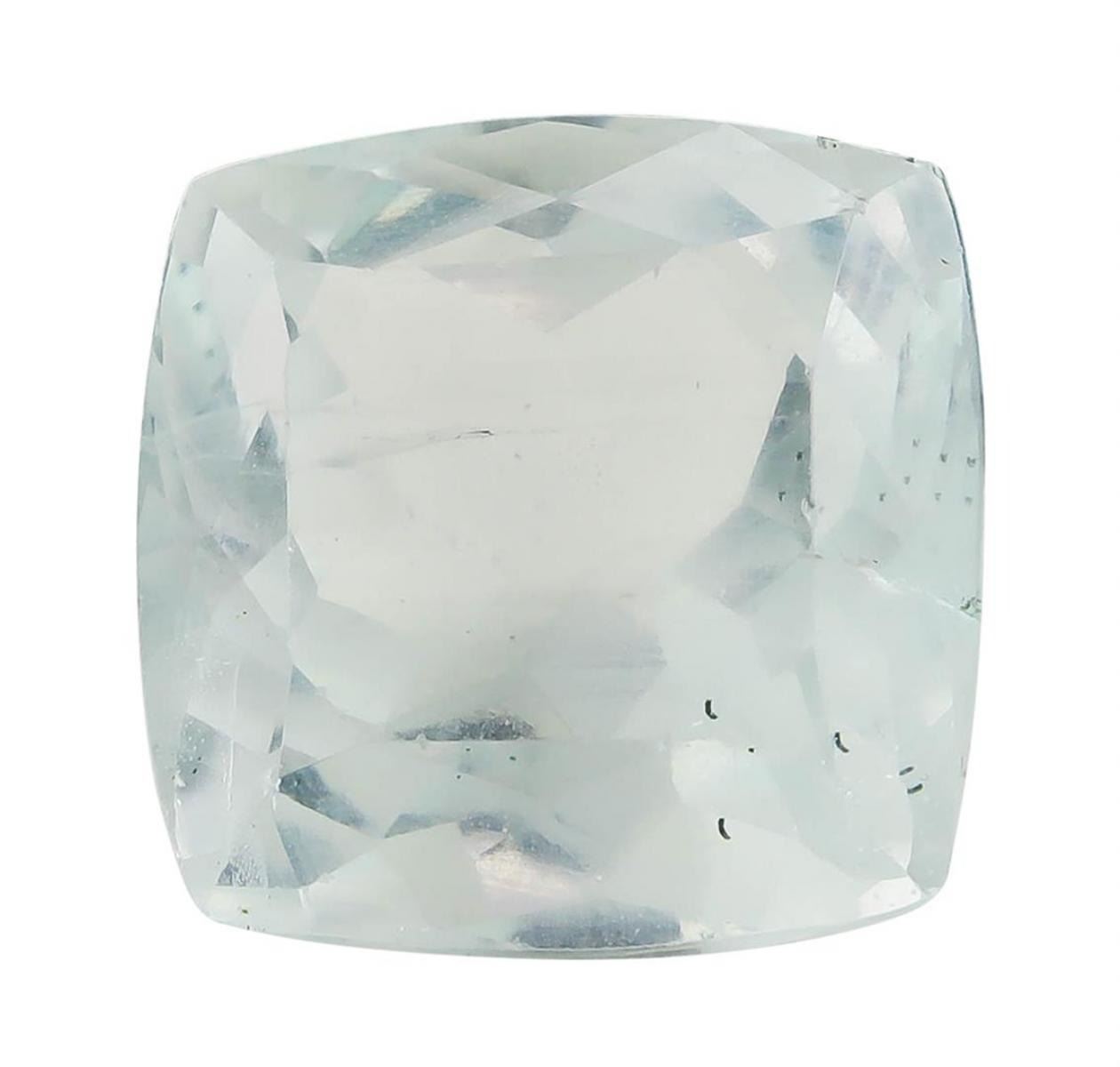 One natural square cushion cut aquamarine with an exact weight of 10.02ct., clarity is moderately included, slightly grayish greenish blue. Gemological Appraisals Services estimates the retail value at $3006 GAS Appraised.