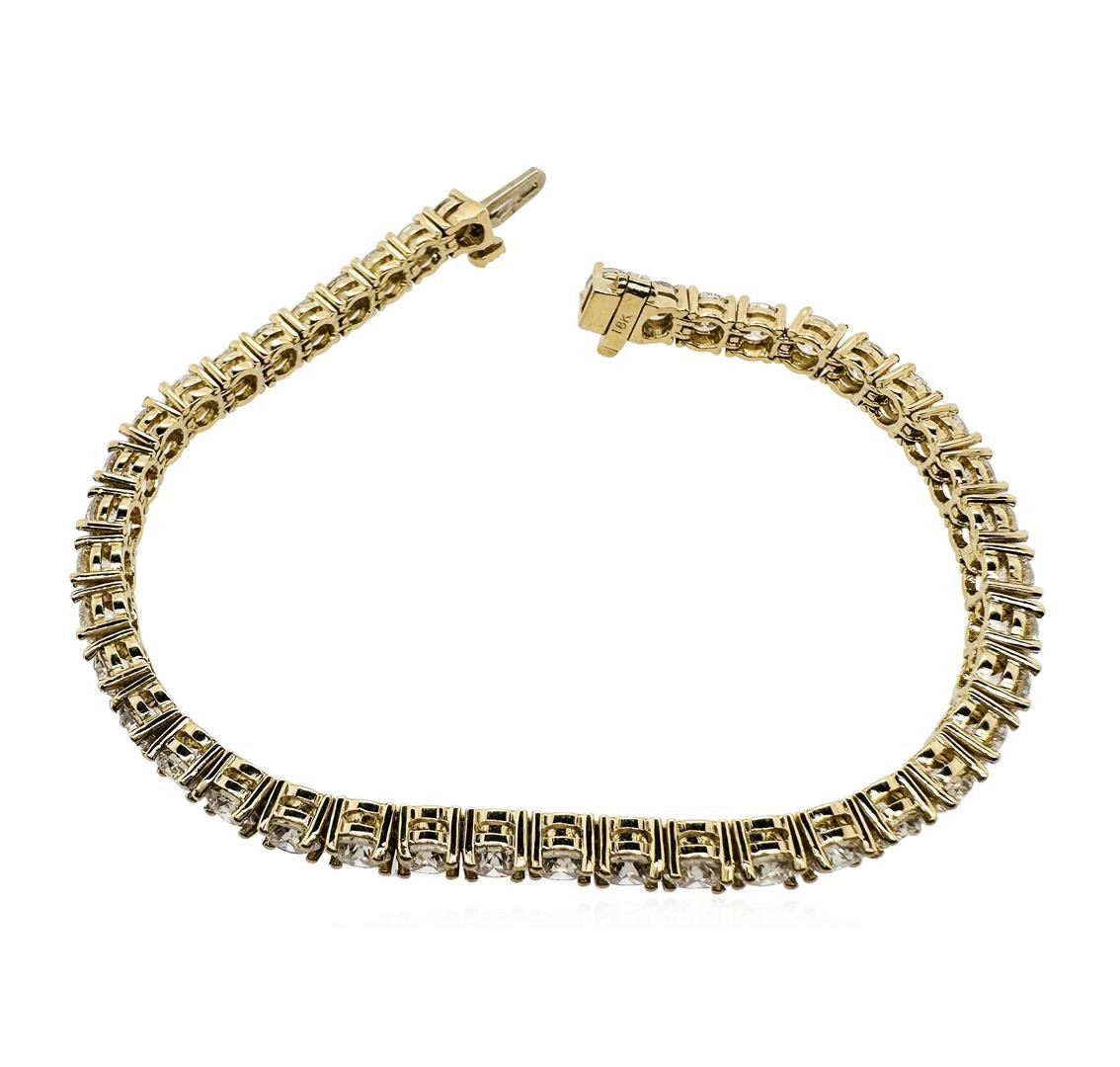 One electronically tested 18KT yellow gold lady's combination cast assembled fashion straight line tennis bracelet tongue with clasp with fold-under safety with basket motif with bright polish finish. Condition new, good workmanship. The featured lady's bracelet measures approximately 6.75 inches length. Identified with markings Of "18K". Containing Forty-two prong set round brilliant cut diamonds, measuring 3.95-3.80 x2. 44mm (depth est.) Total weight of 42 Stones 10.02ct. Graded in the setting. T-H, VS-2 to SI-1, Very Good. Total Weight of Diamonds: 10.02ct. Total weight of Bracelet: 15.20gm. Total Estimated Retail Value: $41550.00