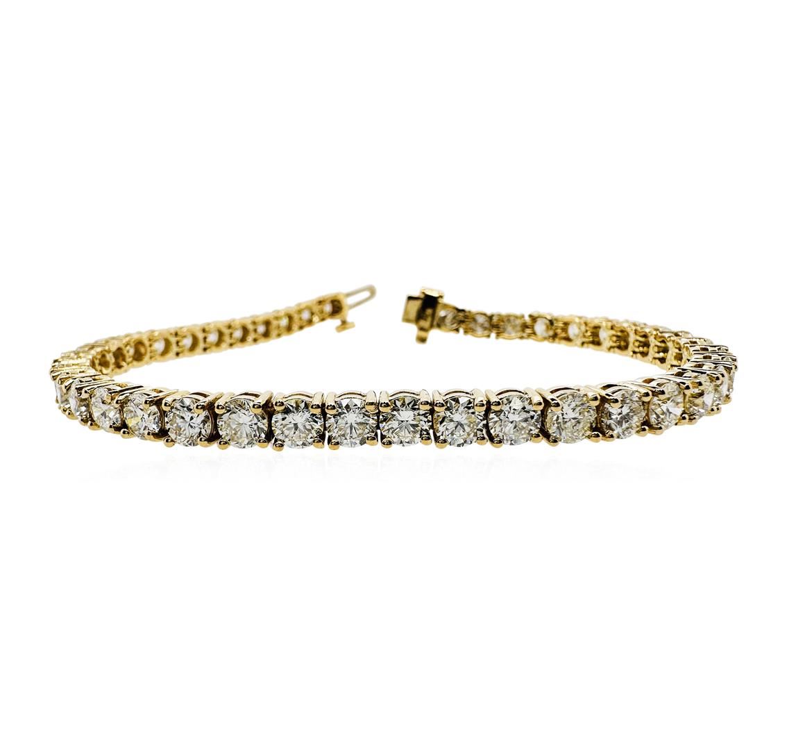 One electronically tested 18KT yellow gold lady's combination cast assembled fashion straight line tennis bracelet tongue with clasp with fold-under safety with basket motif with bright polish finish. Condition new, good workmanship. The featured lady's bracelet measures approximately 6.75 inches length. Identified with markings Of "18K". Containing Forty-two prong set round brilliant cut diamonds, measuring 3.95-3.80 x2. 44mm (depth est.) Total weight of 42 Stones 10.02ct. Graded in the setting. T-H, VS-2 to SI-1, Very Good. Total Weight of Diamonds: 10.02ct. Total weight of Bracelet: 15.20gm. Total Estimated Retail Value: $41550.00