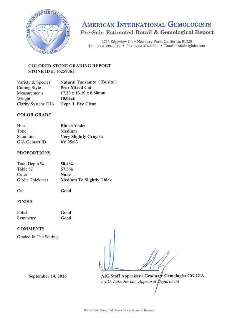 One electronically tested 14KT white gold ladies cast tanzanite, sapphire and diamond ring with a bright polish finish. The featured tanzanite is set within a sapphire and diamond floret supported by a ribbed under gallery, completed by a two millimeter wide band. Identified with markings of 'K14'. Condition is new, good workmanship. Containing: One prong set pear mixed cut natural tanzanite, measuring 17.30 x 13.10 x 6.60mm, approximate weight of 10.02ct., clarity is eye clean, type I, medium, very slightly grayish, bluish violet color, (GIA bV 5/3), cut is good. Transmitting light with no distortion, transparent. Colored Stone Grading Report attached. Graded in the setting. Tanzanite is a very rare gemstone that is only found in the country of Tanzania. Originally discovered in 1967. Tiffany & Company, named the stone Tanzanite. It is found in the Usumburu Mountains that border the Umba Valley of northern Tanzania. Tanzanite occurs in gray, brown, violet, blue, reddish-purple, & green. The gem is interesting because of its exceptional pleochroism. Rotated in different directions a tanzanite will exhibit multiple changes of color. Tanzanite has a low tolerance to ultrasonic cleaning, and should not be cleaned using this method. Ten prong set round mixed cut natural blue sapphires, measuring 2.50 - 2.50 x 1.63 mm, approximate total weight of 0.80ct., clarity is eye clean, type II, medium, very slightly grayish, bluish violet color, (GIA bV 5/3), cut is good. Transmitting light with no distortion, transparent. Indications of laboratory high temperature diffusion treatment. Measurements & the color grade are an average for the group. Graded in the setting. Ten prong set round brilliant cut diamonds, measuring 3.00 - 3.00 x 1.80mm (depth est.) approximate total weight of 10 Stones = 1.08ct. Graded in the setting. Clarity SI-2 to I-2. Color: F - H. Total Weight of Colored Stones 10.82ct.. Total Weight of Diamonds 1.08ct.. Total Weight of Ring 9.24gm. AIG Appraised at $24,945.00.