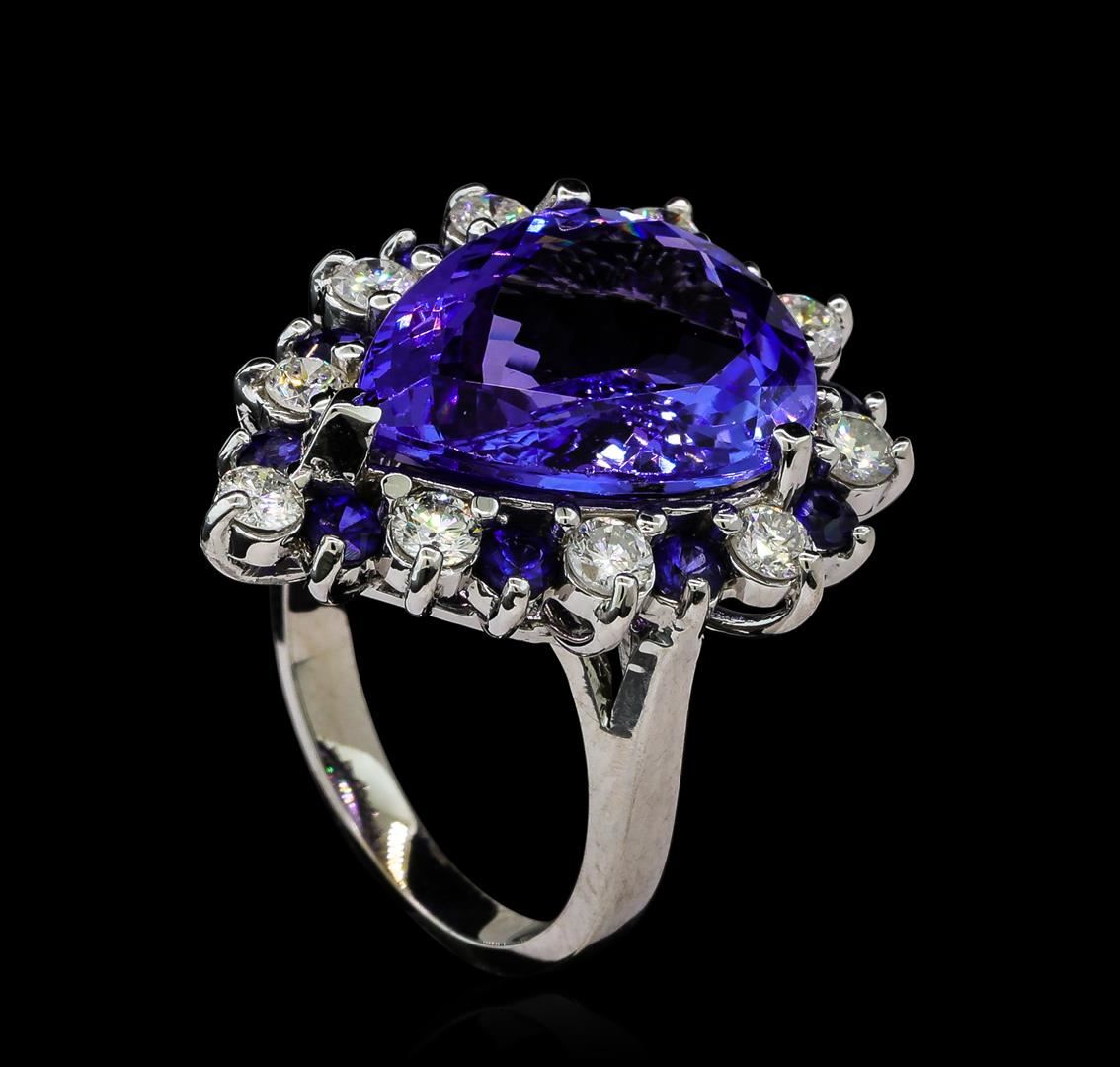 One electronically tested 14KT white gold ladies cast tanzanite, sapphire and diamond ring with a bright polish finish. The featured tanzanite is set within a sapphire and diamond floret supported by a ribbed under gallery, completed by a two millimeter wide band. Identified with markings of 'K14'. Condition is new, good workmanship. Containing: One prong set pear mixed cut natural tanzanite, measuring 17.30 x 13.10 x 6.60mm, approximate weight of 10.02ct., clarity is eye clean, type I, medium, very slightly grayish, bluish violet color, (GIA bV 5/3), cut is good. Transmitting light with no distortion, transparent. Colored Stone Grading Report attached. Graded in the setting. Tanzanite is a very rare gemstone that is only found in the country of Tanzania. Originally discovered in 1967. Tiffany & Company, named the stone Tanzanite. It is found in the Usumburu Mountains that border the Umba Valley of northern Tanzania. Tanzanite occurs in gray, brown, violet, blue, reddish-purple, & green. The gem is interesting because of its exceptional pleochroism. Rotated in different directions a tanzanite will exhibit multiple changes of color. Tanzanite has a low tolerance to ultrasonic cleaning, and should not be cleaned using this method. Ten prong set round mixed cut natural blue sapphires, measuring 2.50 - 2.50 x 1.63 mm, approximate total weight of 0.80ct., clarity is eye clean, type II, medium, very slightly grayish, bluish violet color, (GIA bV 5/3), cut is good. Transmitting light with no distortion, transparent. Indications of laboratory high temperature diffusion treatment. Measurements & the color grade are an average for the group. Graded in the setting. Ten prong set round brilliant cut diamonds, measuring 3.00 - 3.00 x 1.80mm (depth est.) approximate total weight of 10 Stones = 1.08ct. Graded in the setting. Clarity SI-2 to I-2. Color: F - H. Total Weight of Colored Stones 10.82ct.. Total Weight of Diamonds 1.08ct.. Total Weight of Ring 9.24gm. AIG Appraised at $24,945.00.
