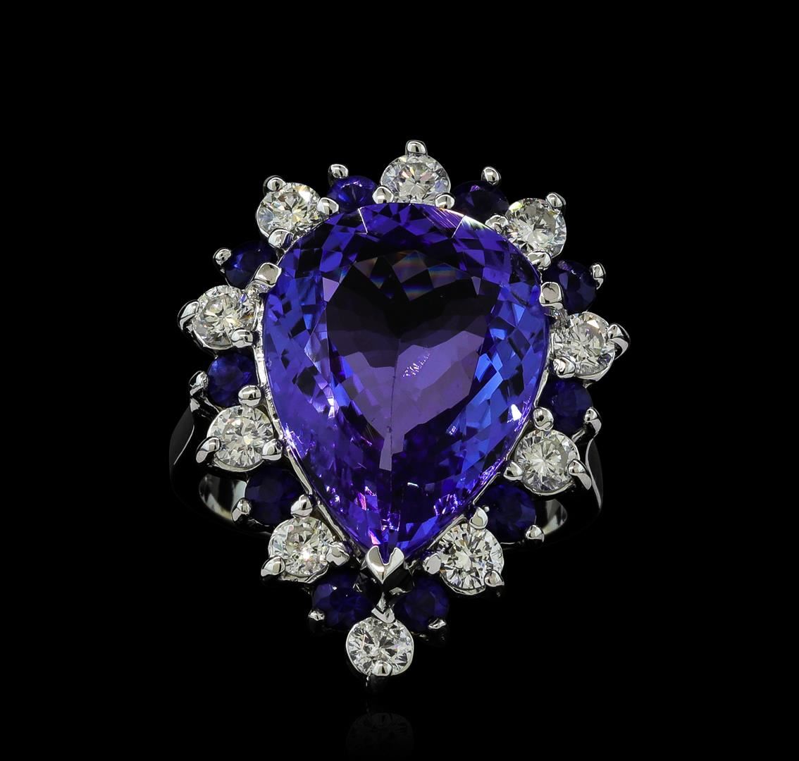 One electronically tested 14KT white gold ladies cast tanzanite, sapphire and diamond ring with a bright polish finish. The featured tanzanite is set within a sapphire and diamond floret supported by a ribbed under gallery, completed by a two millimeter wide band. Identified with markings of 'K14'. Condition is new, good workmanship. Containing: One prong set pear mixed cut natural tanzanite, measuring 17.30 x 13.10 x 6.60mm, approximate weight of 10.02ct., clarity is eye clean, type I, medium, very slightly grayish, bluish violet color, (GIA bV 5/3), cut is good. Transmitting light with no distortion, transparent. Colored Stone Grading Report attached. Graded in the setting. Tanzanite is a very rare gemstone that is only found in the country of Tanzania. Originally discovered in 1967. Tiffany & Company, named the stone Tanzanite. It is found in the Usumburu Mountains that border the Umba Valley of northern Tanzania. Tanzanite occurs in gray, brown, violet, blue, reddish-purple, & green. The gem is interesting because of its exceptional pleochroism. Rotated in different directions a tanzanite will exhibit multiple changes of color. Tanzanite has a low tolerance to ultrasonic cleaning, and should not be cleaned using this method. Ten prong set round mixed cut natural blue sapphires, measuring 2.50 - 2.50 x 1.63 mm, approximate total weight of 0.80ct., clarity is eye clean, type II, medium, very slightly grayish, bluish violet color, (GIA bV 5/3), cut is good. Transmitting light with no distortion, transparent. Indications of laboratory high temperature diffusion treatment. Measurements & the color grade are an average for the group. Graded in the setting. Ten prong set round brilliant cut diamonds, measuring 3.00 - 3.00 x 1.80mm (depth est.) approximate total weight of 10 Stones = 1.08ct. Graded in the setting. Clarity SI-2 to I-2. Color: F - H. Total Weight of Colored Stones 10.82ct.. Total Weight of Diamonds 1.08ct.. Total Weight of Ring 9.24gm. AIG Appraised at $24,945.00.
