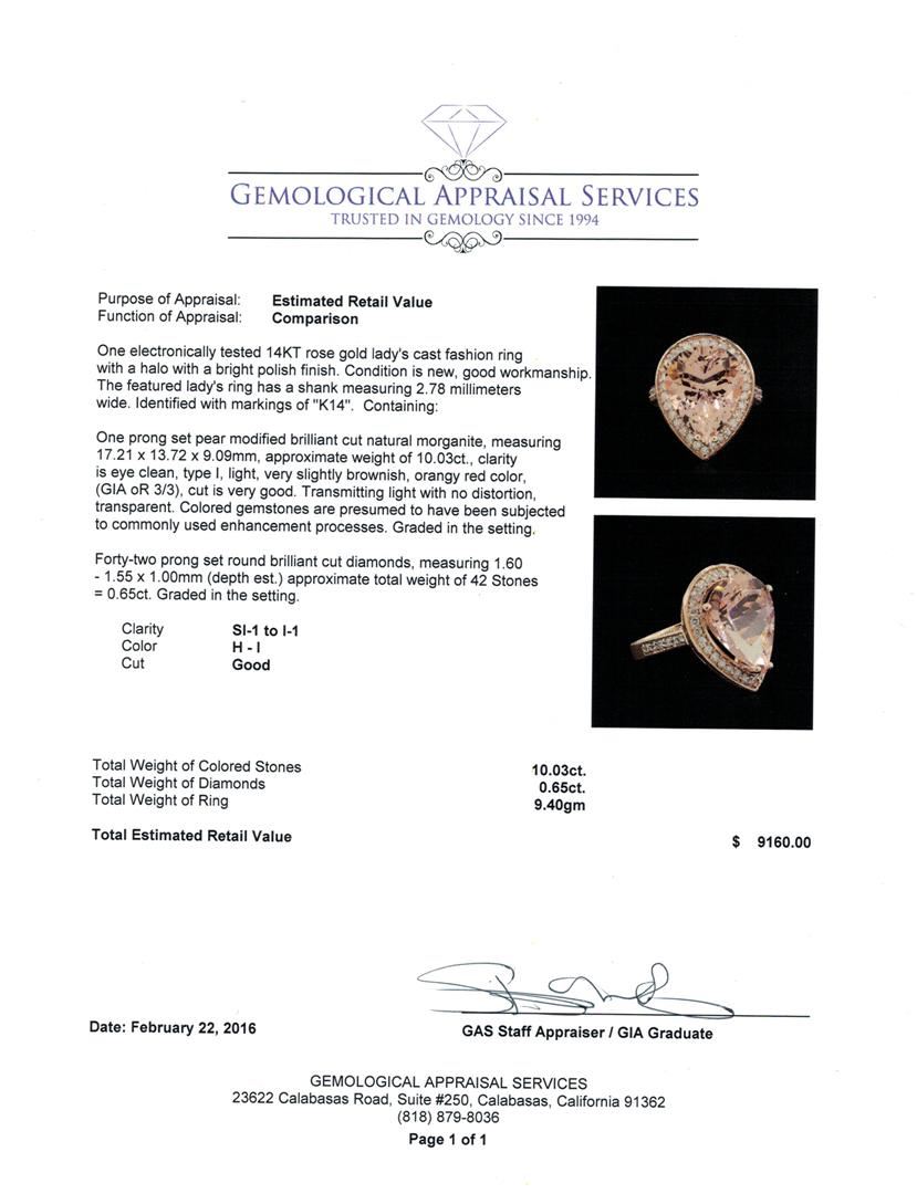 One electronically tested 14KT rose gold lady's cast fashion ring with a halo with a bright polish finish. The featured lady's ring has a shank measuring 2.78 millimeters wide. Identified with markings of "K14". Condition is new, good workmanship. Containing: One prong set pear modified brilliant cut natural morganite, measuring 17.21 x 13.72 x 9.09mm, approximate weight of 10.03ct., clarity is eye clean, type I, light, very slightly brownish, orangy red color, (GIA oR 3/3), cut is very good. Transmitting light with no distortion, transparent. Colored gemstones are presumed to have been subjected to commonly used enhancement processes. Graded in the setting. Forty-Two prong set round brilliant cut diamonds, measuring 1.60 - 1.55 x 1.00mm (depth est.) approximate total weight of 42 Stones = 0.65ct. Graded in the setting. Clarity: SI-1 to I-1. Color: H - I. Cut Good. Total Weight of Colored Stones 10.03ct. Total Weight of Diamonds 0.65ct. Total Weight of Ring 9.40gm. GAS Appraised at $9,160.00.