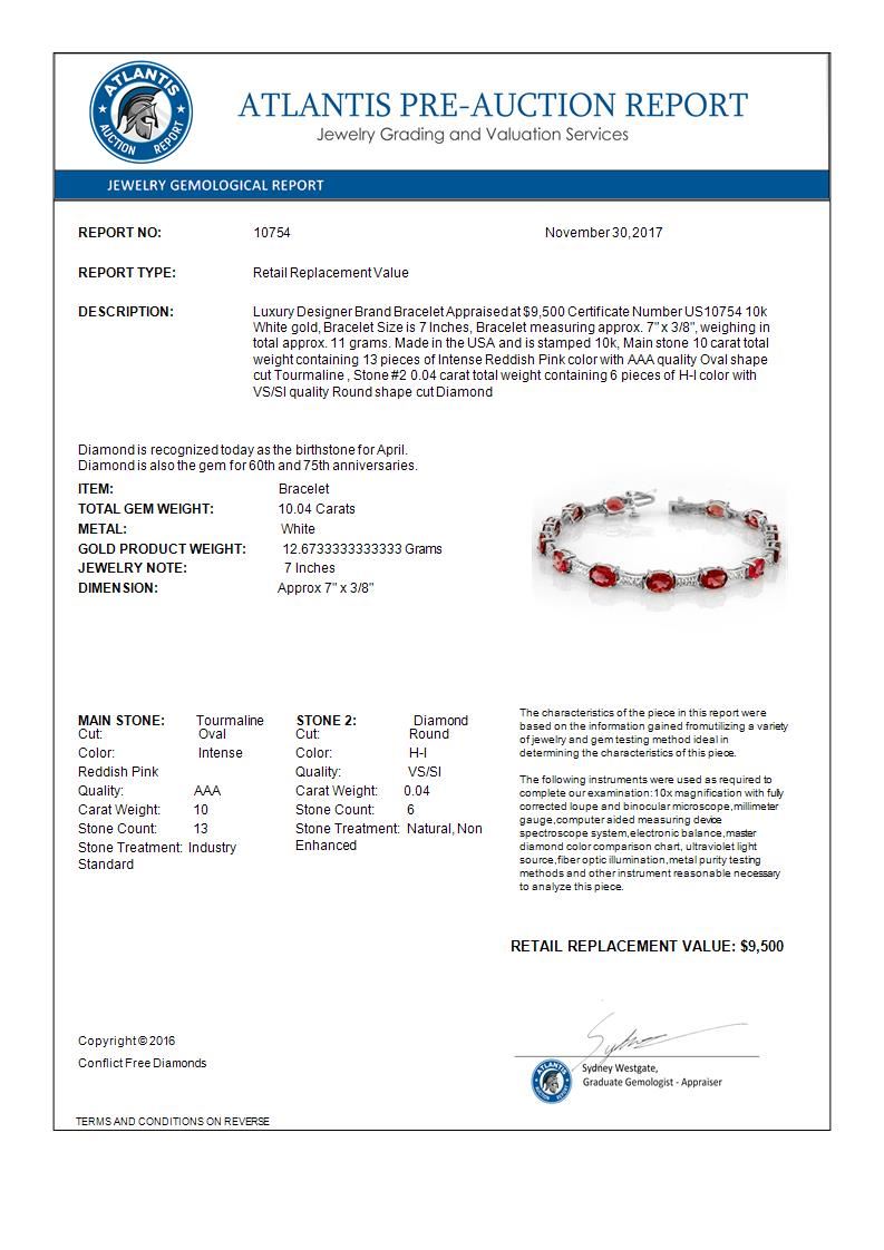 10754 - REF-123R5K ---- 10.04 CTW Pink Tourmaline & Diamond Bracelet 10K White Gold ---- Luxury Designer Brand Bracelet Appraised at $9,500 Certificate Number US10754 10k White gold, Bracelet Size is 7 Inches, Bracelet measuring approx. 7" x 3/8", weighing in total approx. 11 grams. Made in the USA and is stamped 10k, Main stone 10 carat total weight containing 13 pieces of Intense Reddish Pink color with AAA quality Oval shape cut Tourmaline , Stone #2 0.04 carat total weight containing 6 pieces of H-I color with VS/SI quality Round shape cut Diamond