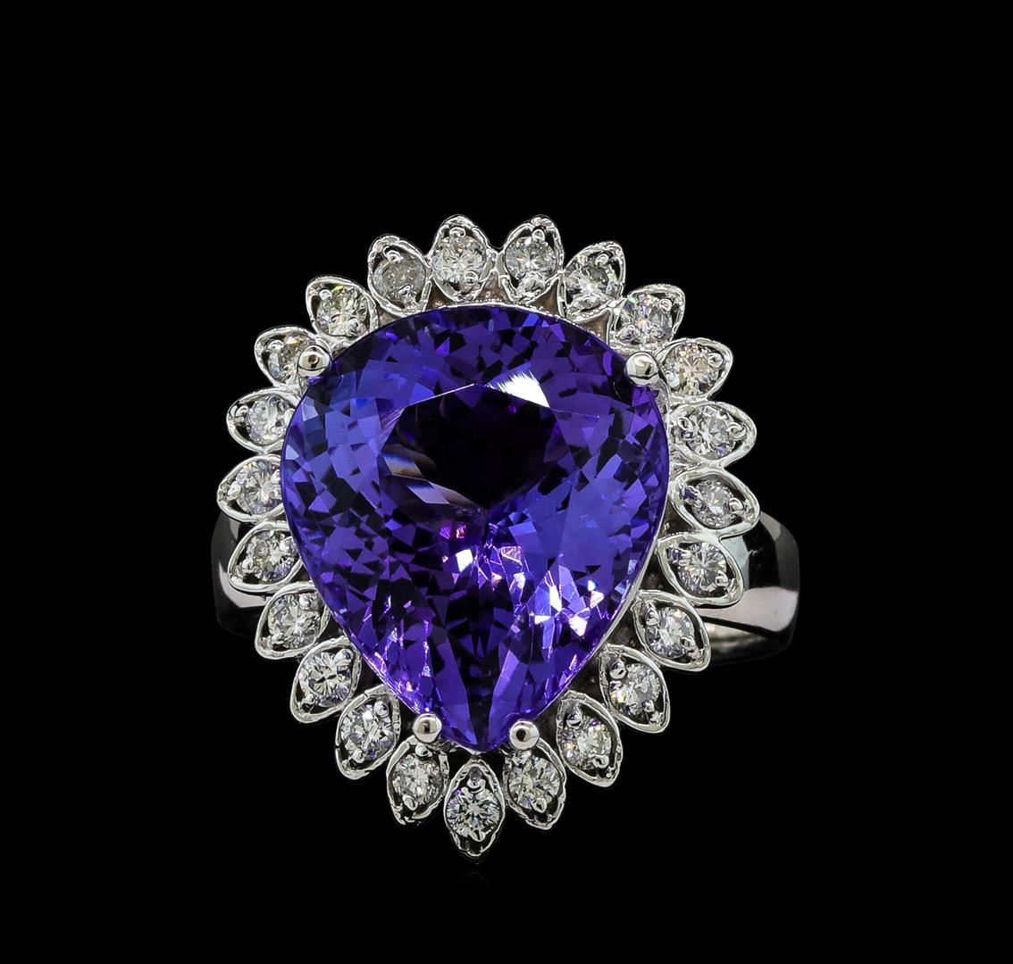 One electronically tested 14KT white gold ladies cast tanzanite and diamond ring with a bright polish finish. The featured tanzanite is set within a diamond floret supported by a ribbed under gallery and tapering shoulders, completed by a two and one-half millimeter wide band. Identified with markings of 'K14'. Condition is new, good workmanship. Containing: One prong set pear mixed cut natural tanzanite, measuring 14.40 x 12.30 x 7.85mm, 8%. bulge factor, approximate weight of 10.06ct., clarity is eye clean, type I, medium, very slightly grayish, bluish violet color, (GIA bV 5/3), cut is good. Transmitting light with no distortion, transparent. Colored Stone Grading Report attached. Graded in the setting. Tanzanite is a very rare gemstone that is only found in the country of Tanzania. Originally discovered in 1967. Tiffany & Company, named the stone Tanzanite. It is found in the Usumburu Mountains that border the Umba Valley of northern Tanzania. Tanzanite occurs in gray, brown, violet, blue, reddish-purple, & green. The gem is interesting because of its exceptional pleochroism. Rotated in different directions a tanzanite will exhibit multiple changes of color. Tanzanite has a low tolerance to ultrasonic cleaning, and should not be cleaned using this method. Twenty-Three prong set round brilliant cut diamonds, measuring 1.70 - 1.70 x 1.02mm (depth est.) approximate total weight of 23 Stones = 0.51ct. The clarity grade reflects the entire range of clarity for this group. Graded in the setting. Clarity SI-1 to I-2. Color: F - H. Total Weight of Colored Stones 10.06ct.. Total Weight of Diamonds 0.51ct.. Total Weight of Ring 8.74gm. AIG Appraised at $23,200.00.