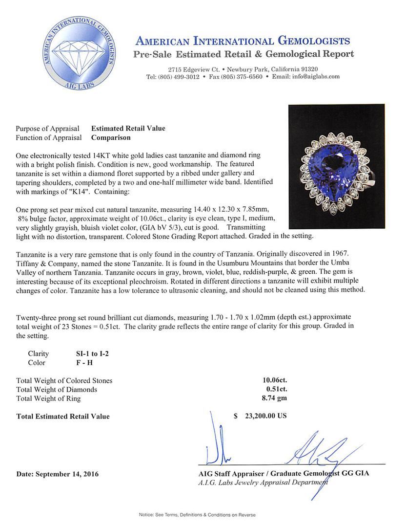 One electronically tested 14KT white gold ladies cast tanzanite and diamond ring with a bright polish finish. The featured tanzanite is set within a diamond floret supported by a ribbed under gallery and tapering shoulders, completed by a two and one-half millimeter wide band. Identified with markings of 'K14'. Condition is new, good workmanship. Containing: One prong set pear mixed cut natural tanzanite, measuring 14.40 x 12.30 x 7.85mm, 8%. bulge factor, approximate weight of 10.06ct., clarity is eye clean, type I, medium, very slightly grayish, bluish violet color, (GIA bV 5/3), cut is good. Transmitting light with no distortion, transparent. Colored Stone Grading Report attached. Graded in the setting. Tanzanite is a very rare gemstone that is only found in the country of Tanzania. Originally discovered in 1967. Tiffany & Company, named the stone Tanzanite. It is found in the Usumburu Mountains that border the Umba Valley of northern Tanzania. Tanzanite occurs in gray, brown, violet, blue, reddish-purple, & green. The gem is interesting because of its exceptional pleochroism. Rotated in different directions a tanzanite will exhibit multiple changes of color. Tanzanite has a low tolerance to ultrasonic cleaning, and should not be cleaned using this method. Twenty-Three prong set round brilliant cut diamonds, measuring 1.70 - 1.70 x 1.02mm (depth est.) approximate total weight of 23 Stones = 0.51ct. The clarity grade reflects the entire range of clarity for this group. Graded in the setting. Clarity SI-1 to I-2. Color: F - H. Total Weight of Colored Stones 10.06ct.. Total Weight of Diamonds 0.51ct.. Total Weight of Ring 8.74gm. AIG Appraised at $23,200.00.