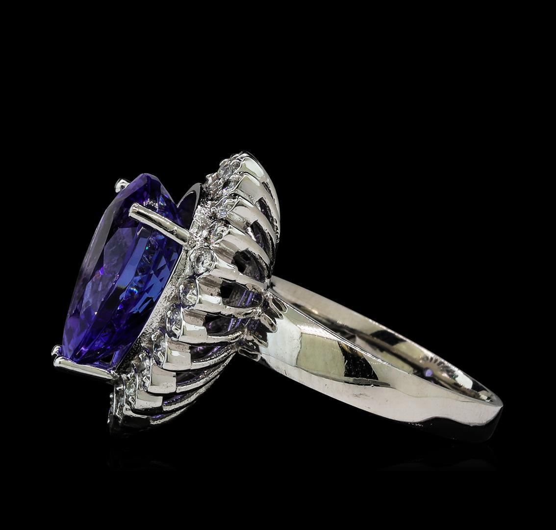 One electronically tested 14KT white gold ladies cast tanzanite and diamond ring with a bright polish finish. The featured tanzanite is set within a diamond floret supported by a ribbed under gallery and tapering shoulders, completed by a two and one-half millimeter wide band. Identified with markings of 'K14'. Condition is new, good workmanship. Containing: One prong set pear mixed cut natural tanzanite, measuring 14.40 x 12.30 x 7.85mm, 8%. bulge factor, approximate weight of 10.06ct., clarity is eye clean, type I, medium, very slightly grayish, bluish violet color, (GIA bV 5/3), cut is good. Transmitting light with no distortion, transparent. Colored Stone Grading Report attached. Graded in the setting. Tanzanite is a very rare gemstone that is only found in the country of Tanzania. Originally discovered in 1967. Tiffany & Company, named the stone Tanzanite. It is found in the Usumburu Mountains that border the Umba Valley of northern Tanzania. Tanzanite occurs in gray, brown, violet, blue, reddish-purple, & green. The gem is interesting because of its exceptional pleochroism. Rotated in different directions a tanzanite will exhibit multiple changes of color. Tanzanite has a low tolerance to ultrasonic cleaning, and should not be cleaned using this method. Twenty-Three prong set round brilliant cut diamonds, measuring 1.70 - 1.70 x 1.02mm (depth est.) approximate total weight of 23 Stones = 0.51ct. The clarity grade reflects the entire range of clarity for this group. Graded in the setting. Clarity SI-1 to I-2. Color: F - H. Total Weight of Colored Stones 10.06ct.. Total Weight of Diamonds 0.51ct.. Total Weight of Ring 8.74gm. AIG Appraised.