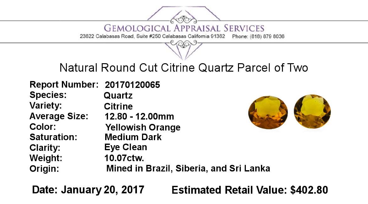 One natural round cut citrine quartz parcel of two with an exact weight of 10.07ctw., clarity is eye clean, yellowish orange, medium dark. Gemological Appraisals Services estimates the retail value at $402.8 GAS Appraised.