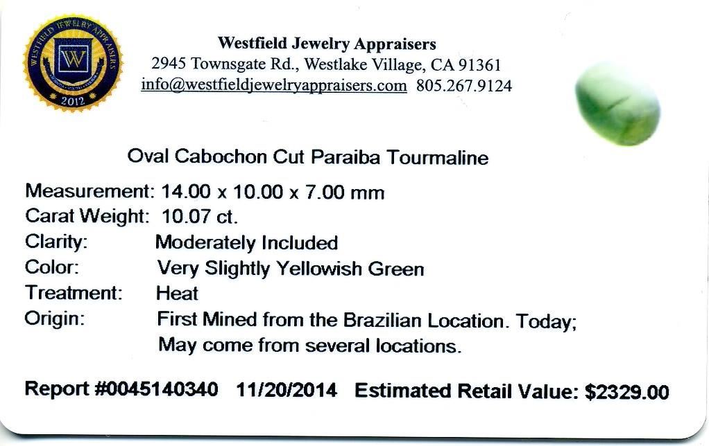 10.07ctw. Oval Cabochon Cut Paraiba Tourmaline. Westfield Appraised at $2,329.00.