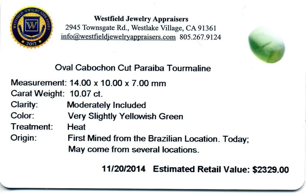 10.07ctw. Oval Cabochon Cut Paraiba Tourmaline. Westfield Appraised at $2,329.00.