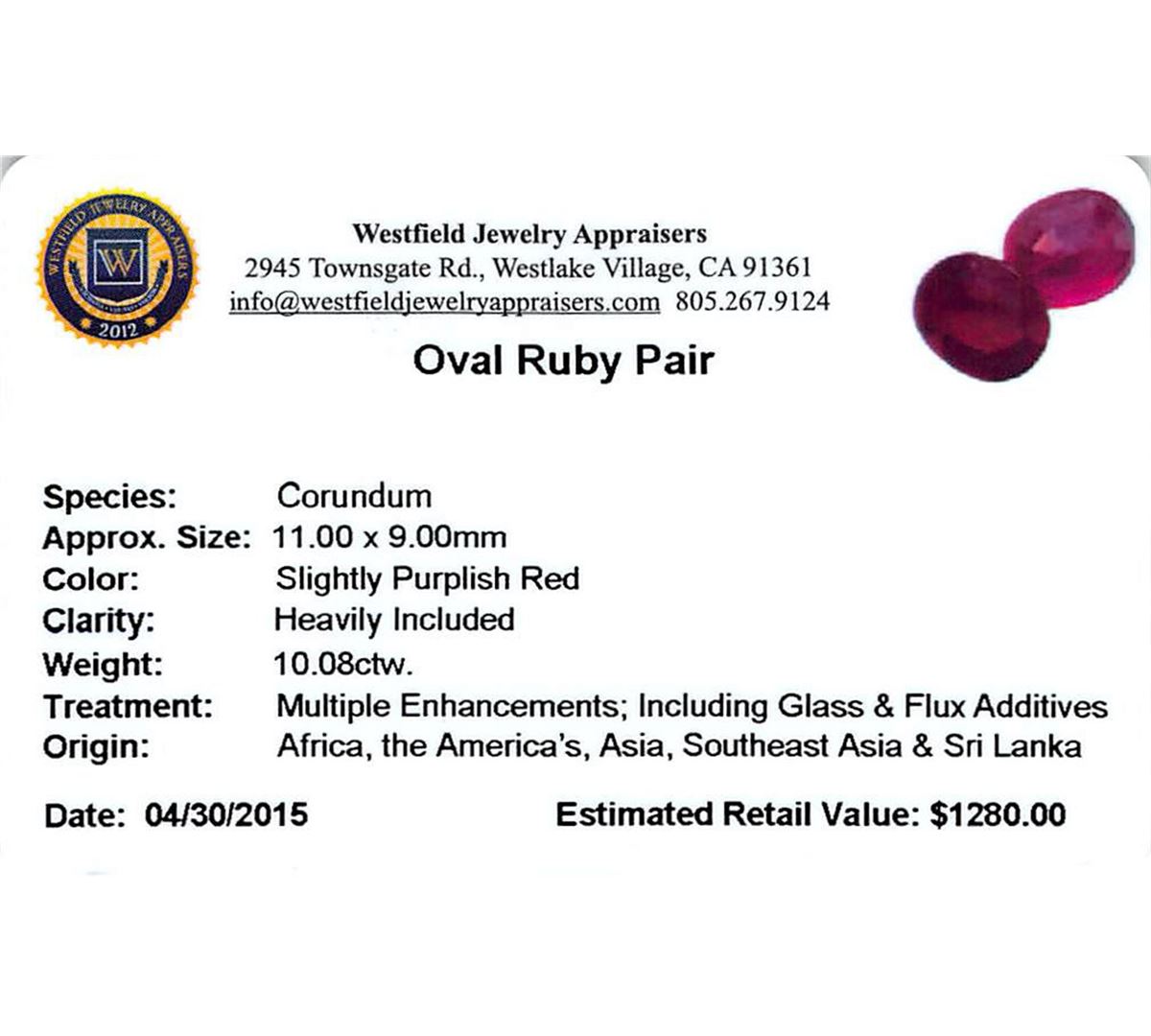 Two oval mixed cut natural rubies exact total weight 10.08ct., clarity is heavily included, type II, dark, very slightly brownish, slightly purplish red color, (GIA slpR 7/3), cut is good. Westfield Appraised at $1,280.00.