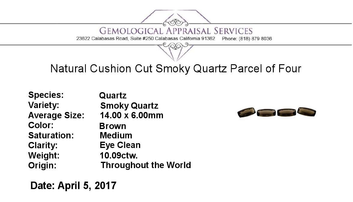 One natural cushion cut smoky quartz parcel of four with an exact weight of 10.09ctw., clarity is eye clean, brown, medium. Gemological Appraisals Services estimates the retail value at $181.62 GAS Appraised.