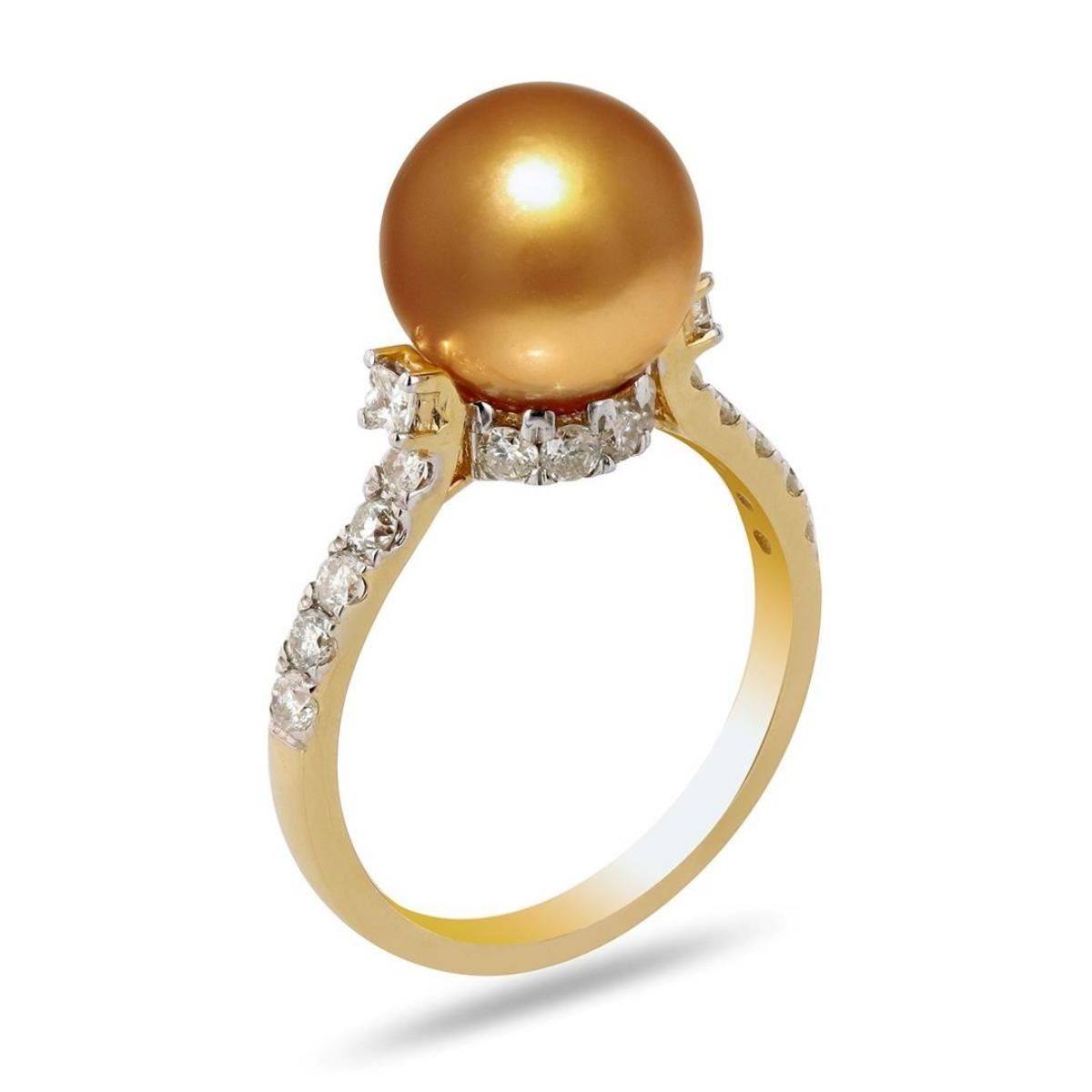 One set electronically tested 18KT yellow gold ladies cast south sea cultured pearl & diamond ring. Condition is new, good workmanship. Featuring a south sea cultured pearl set within mirroring diamond set shoulders, completed by a two millimeter wide band. Trademark is Orianne. Identified with markings of "18K". Containing: One south sea cultured pearl, 10.0mm in size to 10.0mm in size. The pearl is dark golden in color with a good luster, near round, mostly clean Graded in the setting. South Sea Cultured Pearls are farmed in the ocean waters throughout Australia, the Philippines, Indonesia, and the southern coast of China. Australia's main culturing industry is located near the city of Broome, in the northwest, on the Kimberley coast. South Sea cultured pearls form in the Pinctada Maxima oyster, the world's largest (up to 34cm) pearl cultivating oyster. The Indian & Pacific Ocean, the Java & the South China Sea, are the native waters of the Pinctada Maxima oyster. There are two varieties of the Pinctada Maxima: the Gold Lipped oyster which produces the golden color pearls, and the Silver Lipped oyster which produces white color pearls. The South Sea cultured pearl takes from about two to three years to grow. It is produced by inserting a large bead into the oyster when it is about two years old. The South Sea pearl nacre has a unique satiny appearance, due partly to the fast moving and clean waters on the South Seas. Twenty prong set round & princess cut diamonds approximate total weight of 20 Stones = 0.65ctw. Graded in the setting. Clarity SI-2 to I-2 Color J - L Total Weight of Diamonds 0.65ctw. Total Weight of Ring 4.90 gm