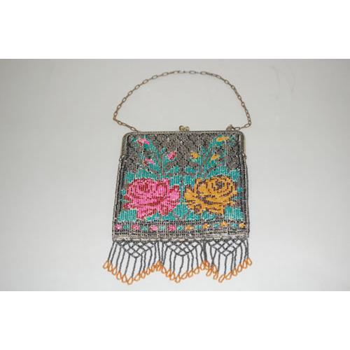 10 1/2" FANCY VICTORIAN BEADED PURSE - CHASED<BR>SILVERPLATED FRAME W/ POLYCHROME GLASS BEADED BAG W/<BR>FLORAL DECORATION, BEADED FRINGE & CHAIN HANDLE-MARKED<BR>GERMANY - WEAR, LOSSES, IMPERFECTIONS
