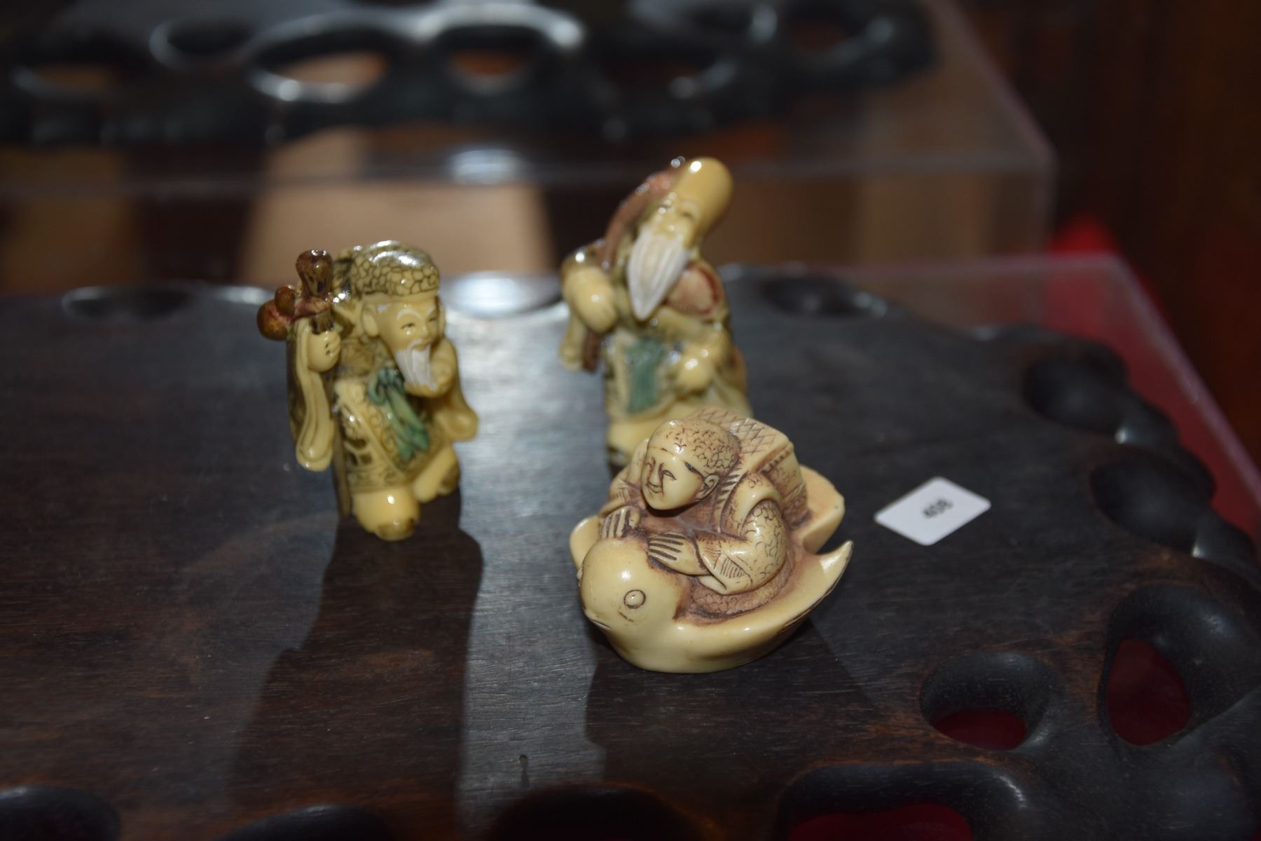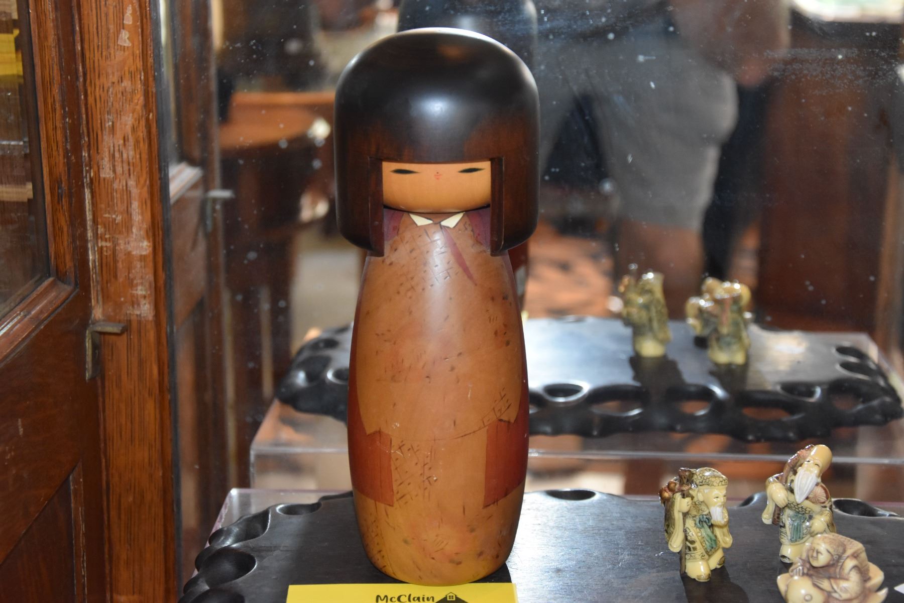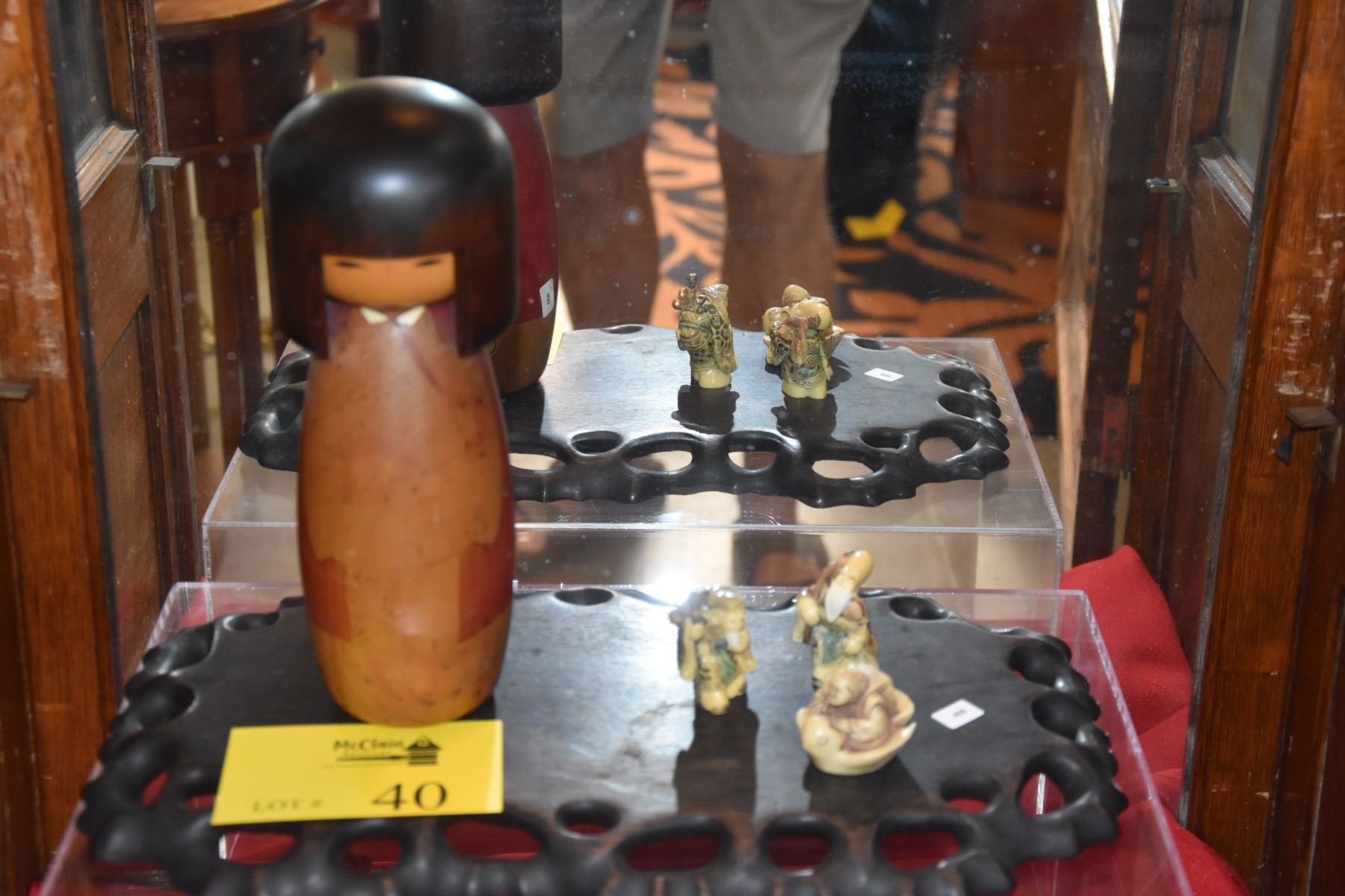 10 1/2" JAPANESE WOOD KOKESHI DOLL, 3 NETSUKES & HARDWOOD STAND (5 PCS)
