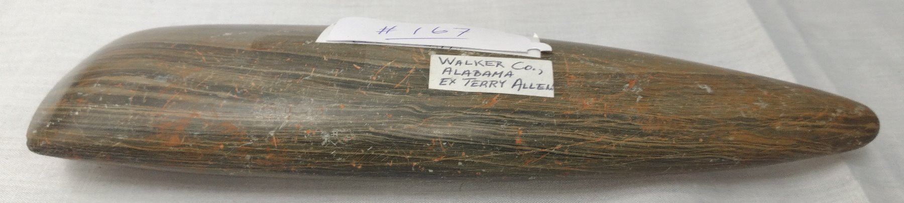 10 1/2" Slate Celt, pre-historic item. Made of banded slate, the item measures 10 1/2". Walker County, Alabama. Ex-Terry Allen. Condition: Scratches and nicks, see images. Shipping: $24.50 w/insurance and signature.