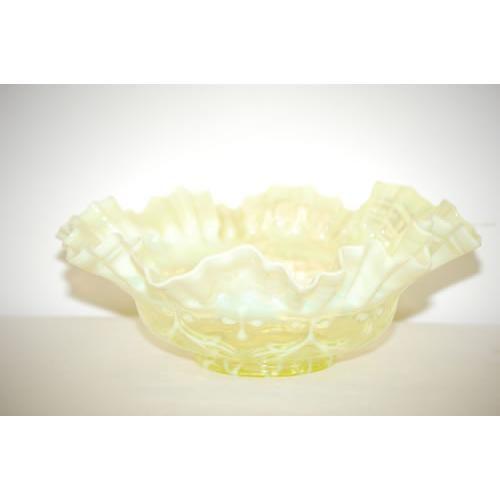 10 1/2" VASELINE OPALESCENT ART GLASS BOWL-SPANISH LACE PATTERN, UNMARKED (PROBABLY INSERT TO BRIDES BASKET)(4" T X 10 1/2" DIA.) - LIGHT WEAR