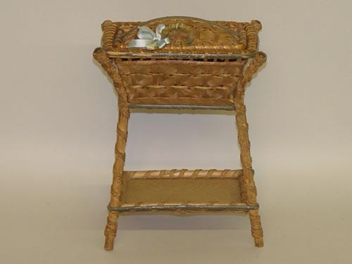 10 1/2" VICTORIAN 2 TIER WOVEN SPLINT TOY SEWING STAND BASKET W/ LOWER TIER SHELF MARKED GERMANY