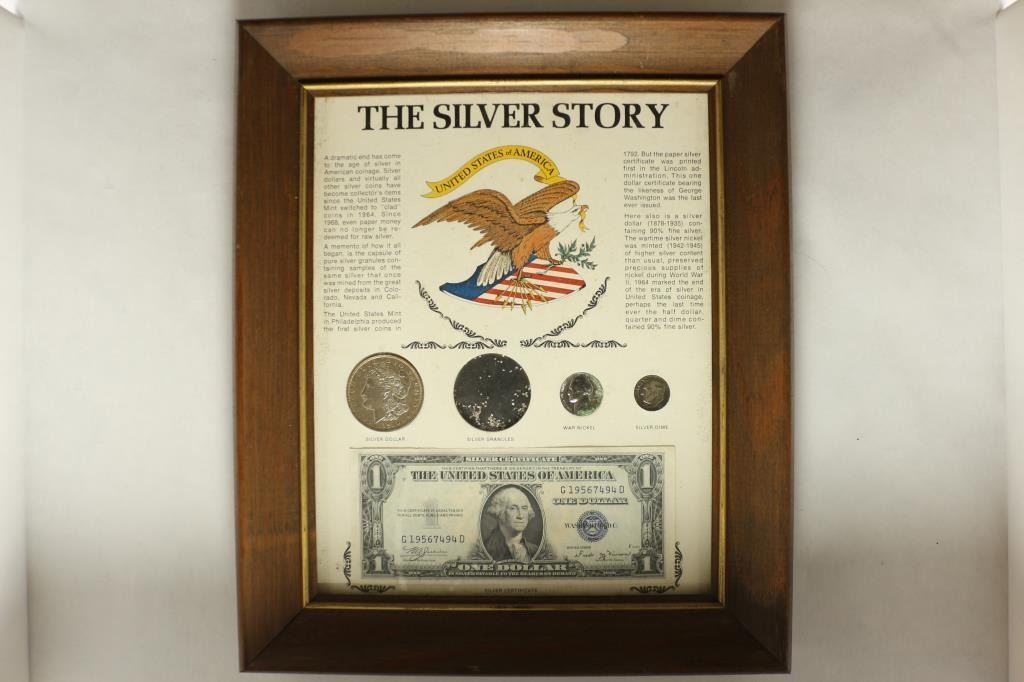 CONTAINS: 1921 MORGAN SILVER DOLLAR, SILVER ROOSEVELT DIME, 35% SILVER JEFFERSON WAR NICKEL, 1935-B $1 SILVER CERTIFICATE AND SILVER GRANULES