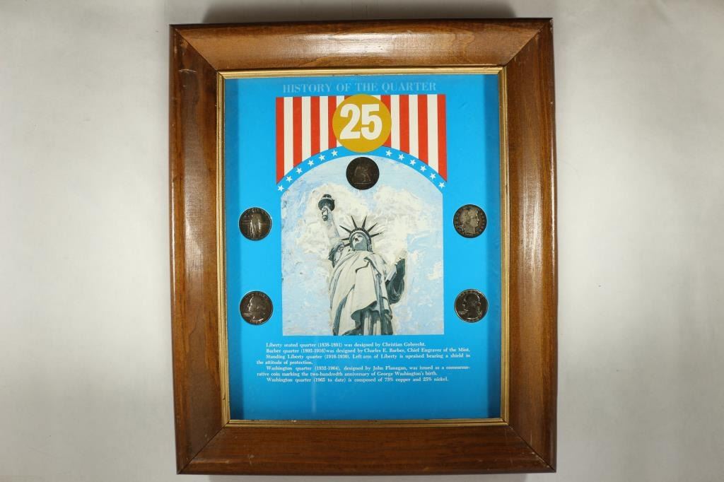 CONTAINS: 1875 SEATED LIBERTY QUARTER, 1915 BARBER QUARTER, 1926 STANDING LIBERTY QUARTER, 1964 WASHINGTON SILVER QUARTER AND 1974 QUARTER