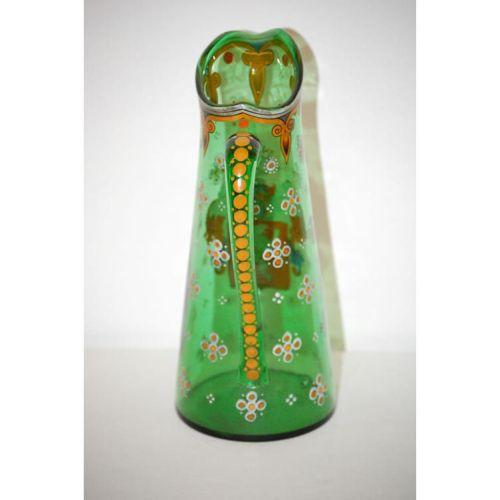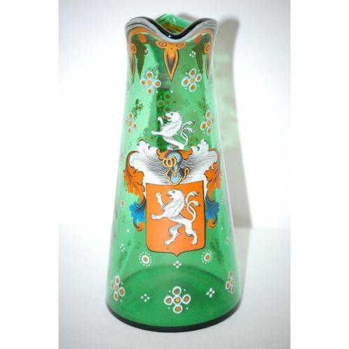 10 1/4" BOHEMIAN ENAMEL DECORATED EWER W/ FAMILY CREST OR COAT OF ARMS ON LIGHT GREEN GLASS-UNMARKED, POLISHED BOTTOM W/ APPLIED HANDLE (PROBABLY GERMAN OR AUSTRIAN) - MINOR WEAR & SCRATCHES