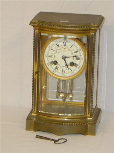 10 1/4" FRENCH BRASS & CRYSTAL REGULATOR CLOCK W/ BOWED FRONT GLASS DECORATED PORCELAIN FACE, SIGNED ? - WEAR & IMPERFECTIONS