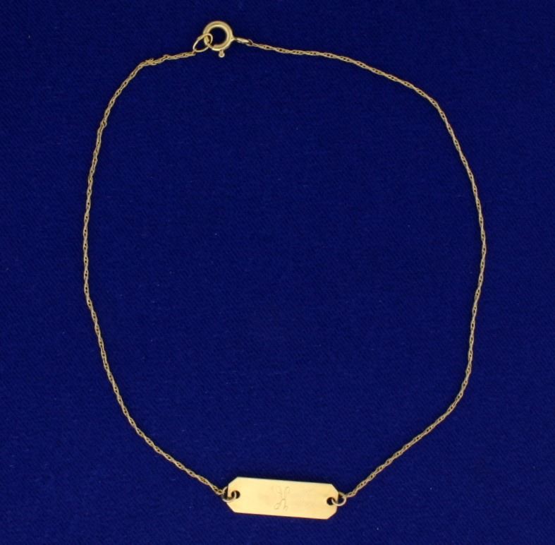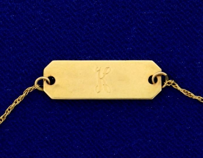 In 14k yellow gold, "K" printed on 6.75x21mm plate. Rope Style chain. 1.3g.