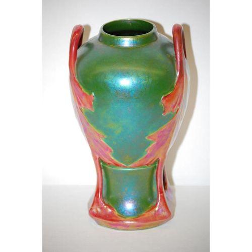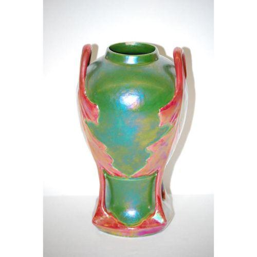 10 1/4" TEPLITZ AMPHORA TYPE POTTERY VASE-GREEN IRIDESCENT BODY W/ RED IRIDESCENT HANDLES W/ LEAF DECORATIONS & DETACHED STEMS, UNMARKED - CRAZING, MINOR WEAR