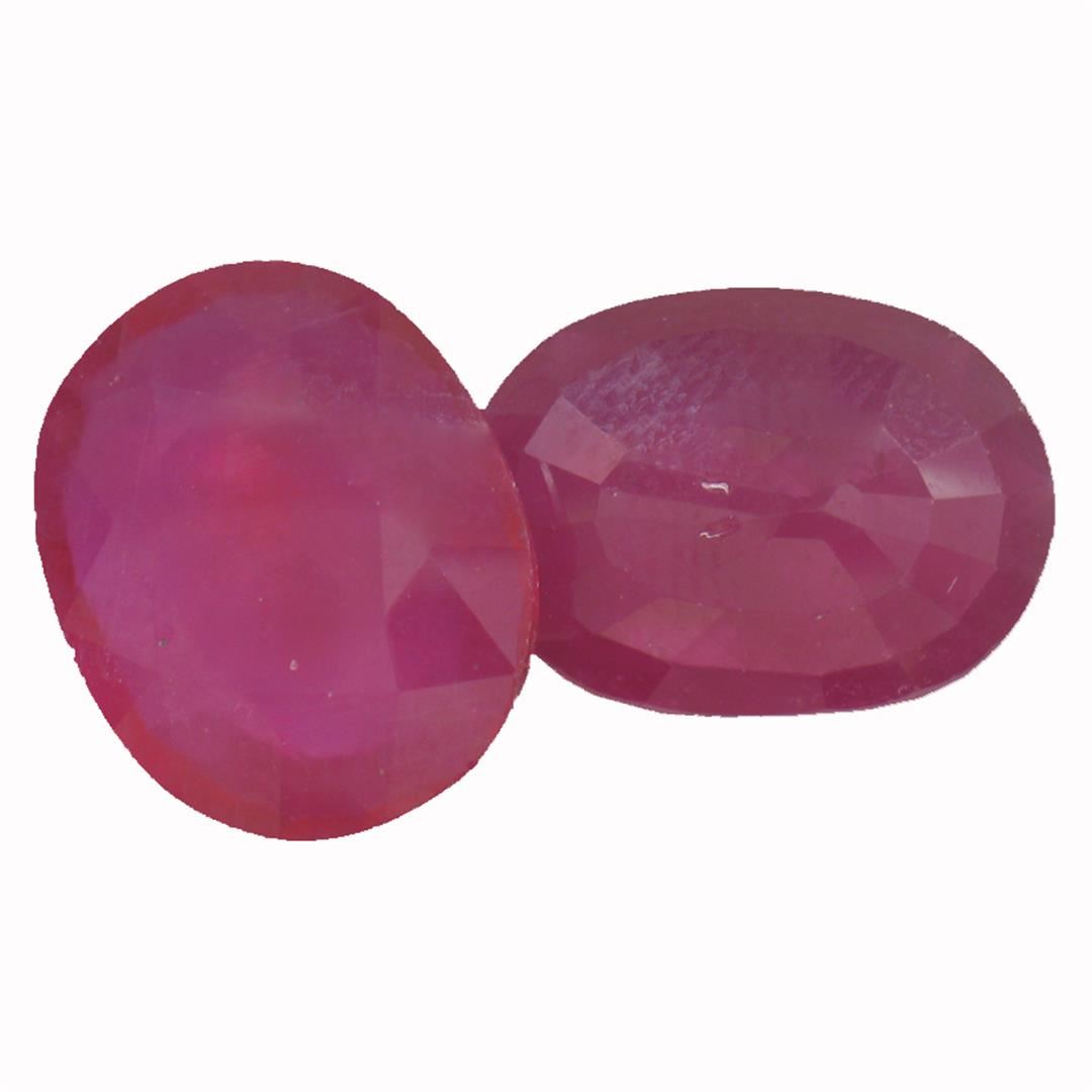 Two oval mixed cut natural rubies, measuring 13.00 x 10.00 x 5.00mm, exact total weight 10.10ct., clarity is heavily included, type II, medium dark, slightly brownish, slightly purplish red color, (GIA slpR 6/2), cut is good. Transmitting light somewhat diffusely, translucent. Naturally occurring internal & external characteristics are present. Indications of laboratory high temperature heat treatment, with glass & flux additives. Ruby has a low tolerance to rhodium plating, repolishing the surface, & ultrasonic cleaning. Westfield Appraised at $1,180.00.