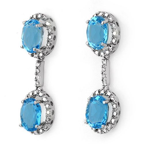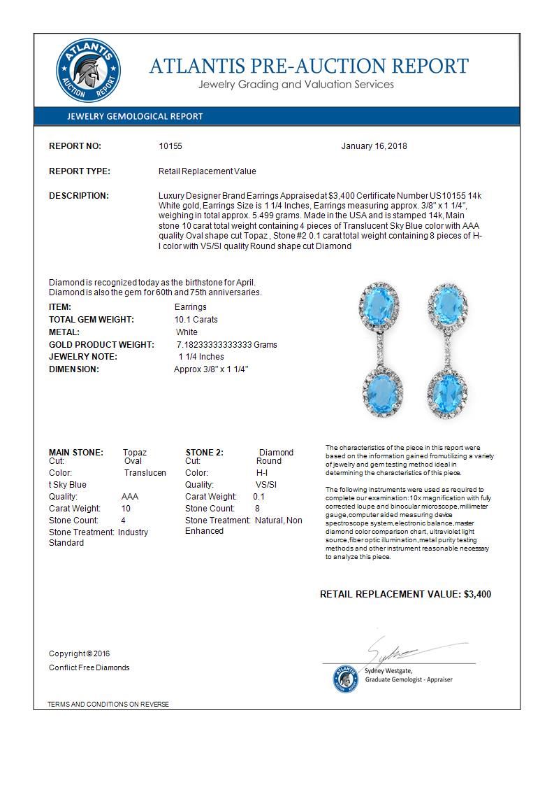 REF-47Y6K -10155 ---- 10.10 CTW Blue Topaz & Diamond Earrings 14K White Gold ---- Luxury Designer Brand Earrings Appraised at $3,400 Certificate Number US10155 14k White gold, Earrings Size is 1 1/4 Inches, Earrings measuring approx. 3/8" x 1 1/4", weighing in total approx. 5.499 grams. Made in the USA and is stamped 14k, Main stone 10 carat total weight containing 4 pieces of Translucent Sky Blue color with AAA quality Oval shape cut Topaz , Stone #2 0.1 carat total weight containing 8 pieces of H-I color with VS/SI quality Round shape cut Diamond
