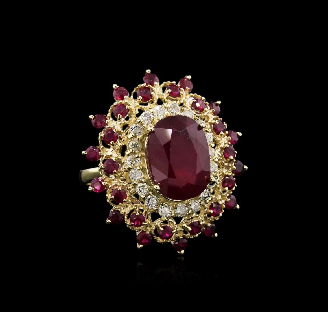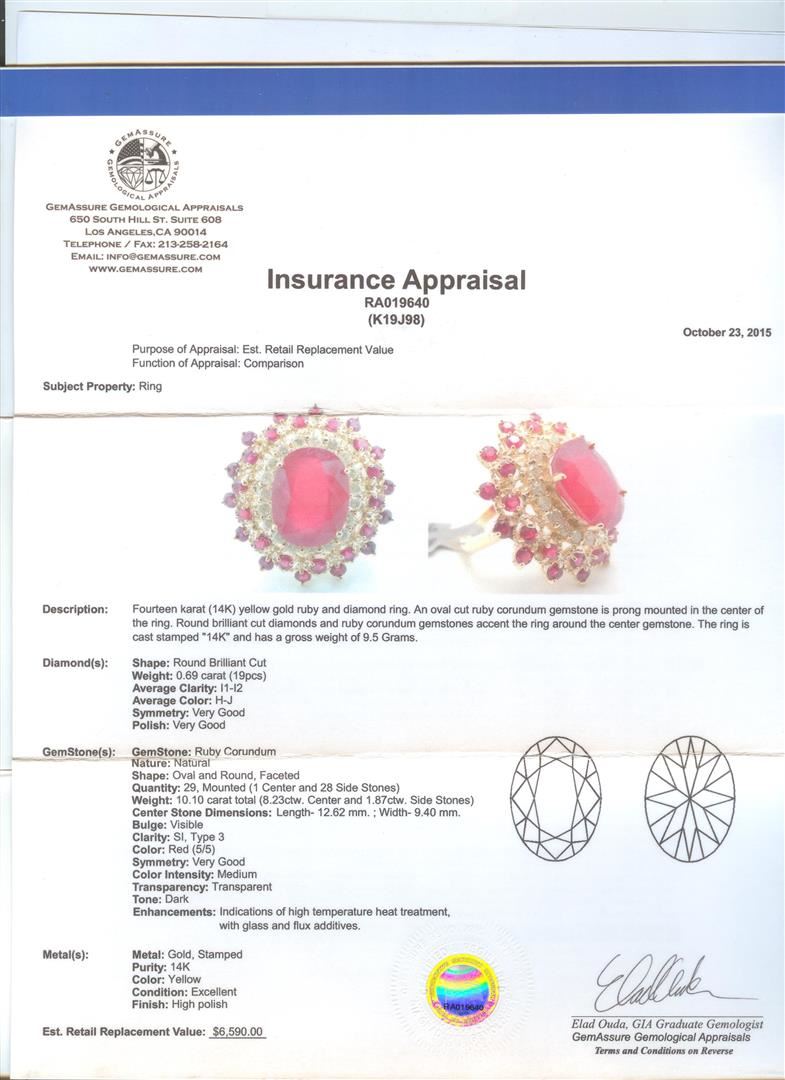 Fourteen karat (14K) yellow gold ruby and diamond ring. An oval cut ruby corundum gemstone is prong mounted in the center of the ring. Round brilliant cut diamonds accent the ring around the center gemstone. The ring is cast stamped "14K" and has a gross weight of 9.5 Grams. Diamond(s): Shape: Round Brilliant Cut. Weight: 0.69 carat (19pcs). Average Clarity: I1-I2. Average Color: H-J. Symmetry: Very Good. Polish: Very Good. GemStone(s): Ruby Corundum. Nature: Natural. Shape: Oval, Faceted. Quantity: 29, Mounted 1 (Center and 28 Side Stones). Weight: 10.10 carat total (8.23ctw. Center and 1.87ctw. Side Stones). Dimensions: Length- 12.62 mm. ; Width 9.40 mm. Bulge: Visible. Clarity: SI, Type 3. Color: Red (5/5). Symmetry: Very Good. Color Intensity: Medium. Transparency: Transparent. Tone: Dark. Enhancements: Indications of high temperature heat treatment, with glass and flux additives. Metal(s): Metal: Gold, Stamped. Purity: 14K. Color: Yellow. Condition: Excellent. Finish: High polish. GGA Appraised at $6,590.00.