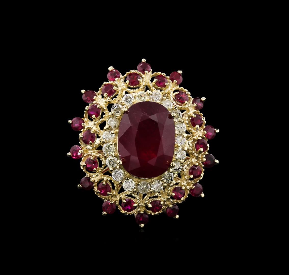 Fourteen karat (14K) yellow gold ruby and diamond ring. An oval cut ruby corundum gemstone is prong mounted in the center of the ring. Round brilliant cut diamonds accent the ring around the center gemstone. The ring is cast stamped "14K" and has a gross weight of 9.5 Grams. Diamond(s): Shape: Round Brilliant Cut. Weight: 0.69 carat (19pcs). Average Clarity: I1-I2. Average Color: H-J. Symmetry: Very Good. Polish: Very Good. GemStone(s): Ruby Corundum. Nature: Natural. Shape: Oval, Faceted. Quantity: 29, Mounted 1 (Center and 28 Side Stones). Weight: 10.10 carat total (8.23ctw. Center and 1.87ctw. Side Stones). Dimensions: Length- 12.62 mm. ; Width 9.40 mm. Bulge: Visible. Clarity: SI, Type 3. Color: Red (5/5). Symmetry: Very Good. Color Intensity: Medium. Transparency: Transparent. Tone: Dark. Enhancements: Indications of high temperature heat treatment, with glass and flux additives. Metal(s): Metal: Gold, Stamped. Purity: 14K. Color: Yellow. Condition: Excellent. Finish: High polish. GGA Appraised at $6,590.00.