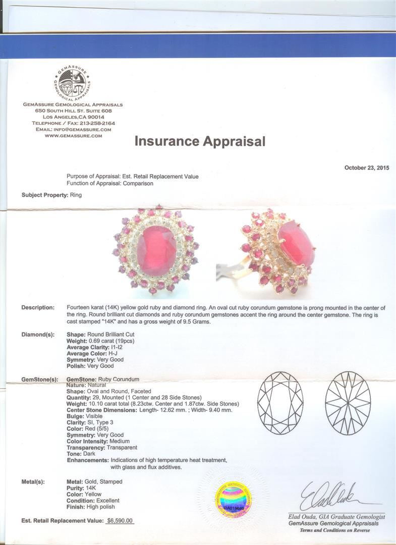 Fourteen karat (14K) yellow gold ruby and diamond ring. An oval cut ruby corundum gemstone is prong mounted in the center of the ring. Round brilliant cut diamonds accent the ring around the center gemstone. The ring is cast stamped "14K" and has a gross weight of 9.5 Grams. Diamond(s): Shape: Round Brilliant Cut. Weight: 0.69 carat (19pcs). Average Clarity: I1-I2. Average Color: H-J. Symmetry: Very Good. Polish: Very Good. GemStone(s): Ruby Corundum. Nature: Natural. Shape: Oval, Faceted. Quantity: 29, Mounted 1 (Center and 28 Side Stones). Weight: 10.10 carat total (8.23ctw. Center and 1.87ctw. Side Stones). Dimensions: Length- 12.62 mm. ; Width 9.40 mm. Bulge: Visible. Clarity: SI, Type 3. Color: Red (5/5). Symmetry: Very Good. Color Intensity: Medium. Transparency: Transparent. Tone: Dark. Enhancements: Indications of high temperature heat treatment, with glass and flux additives. Metal(s): Metal: Gold, Stamped. Purity: 14K. Color: Yellow. Condition: Excellent. Finish: High polish. GGA Appraised at $6,590.00.