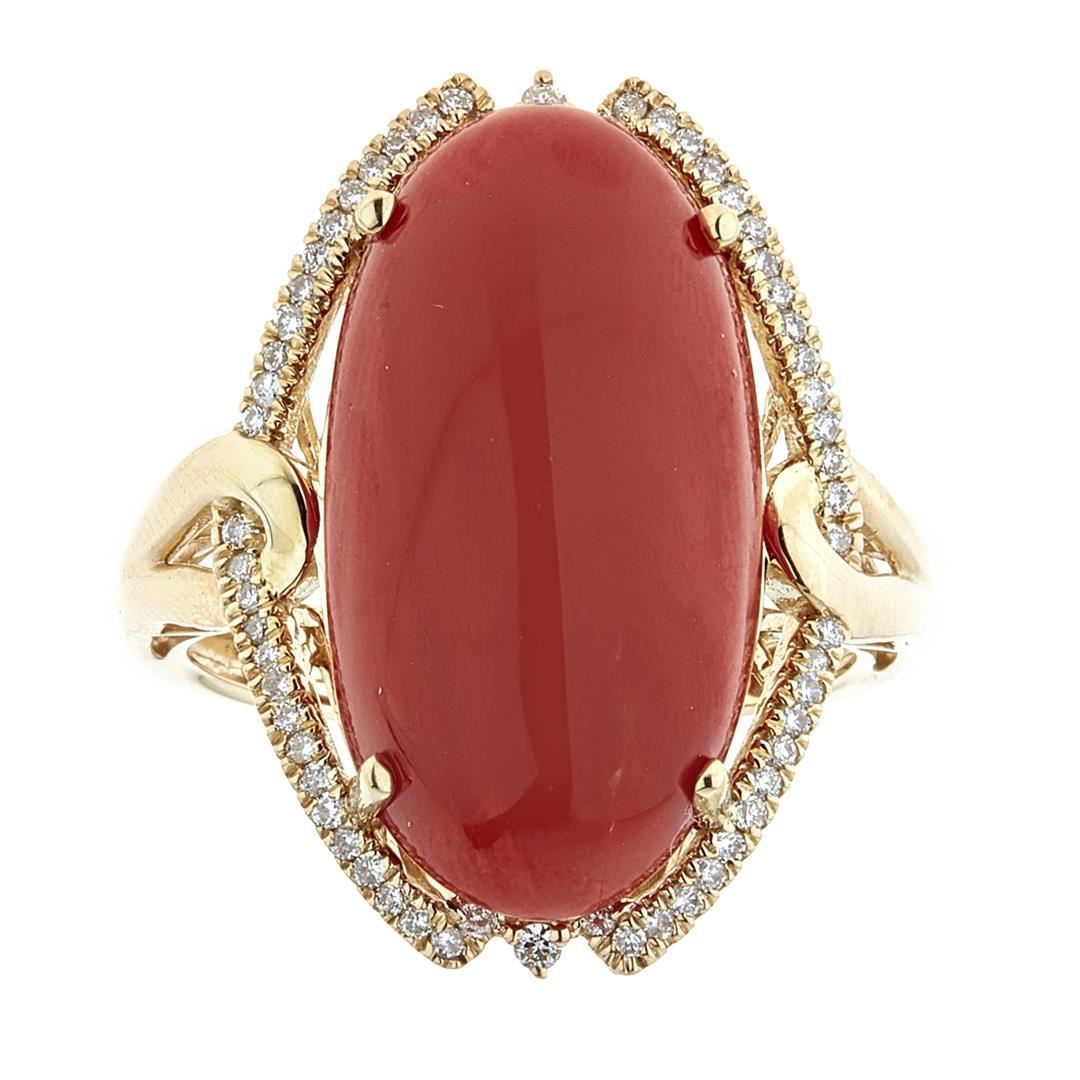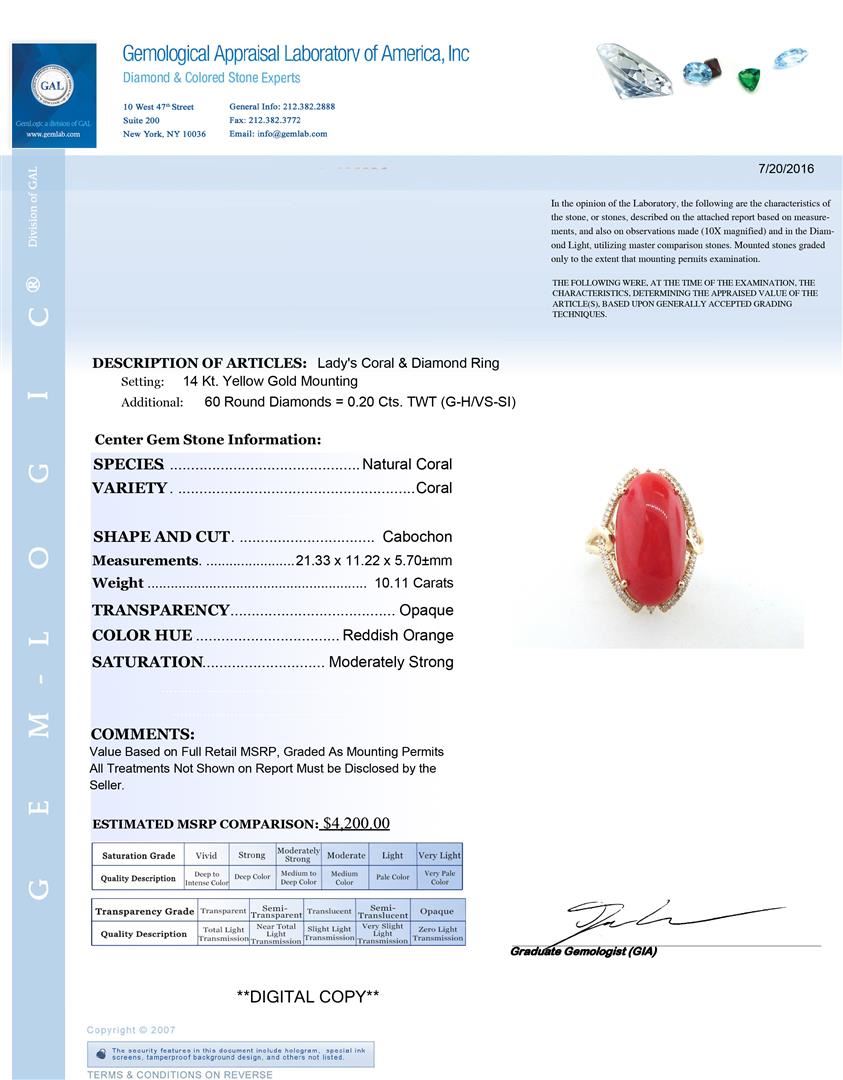 One Lady's Coral and Diamond Ring. Setting: 14 Kt. Yellow Gold Mounting. Additional: 60 Round Diamonds = 0.20 Cts. TWT (G-H/VS-SI). Center Gem Stone Information: Species: Natural Coral. Variety: Coral. Shape and Cut: Cabochon. Measurements: 21.33 x 11.22 x 5.70mm. Weight: 10.11 Carats. Transparency: Opaque. Color Hue: Reddish Orange. Saturation: Moderately Strong. Total Weight: 4.51 grams.