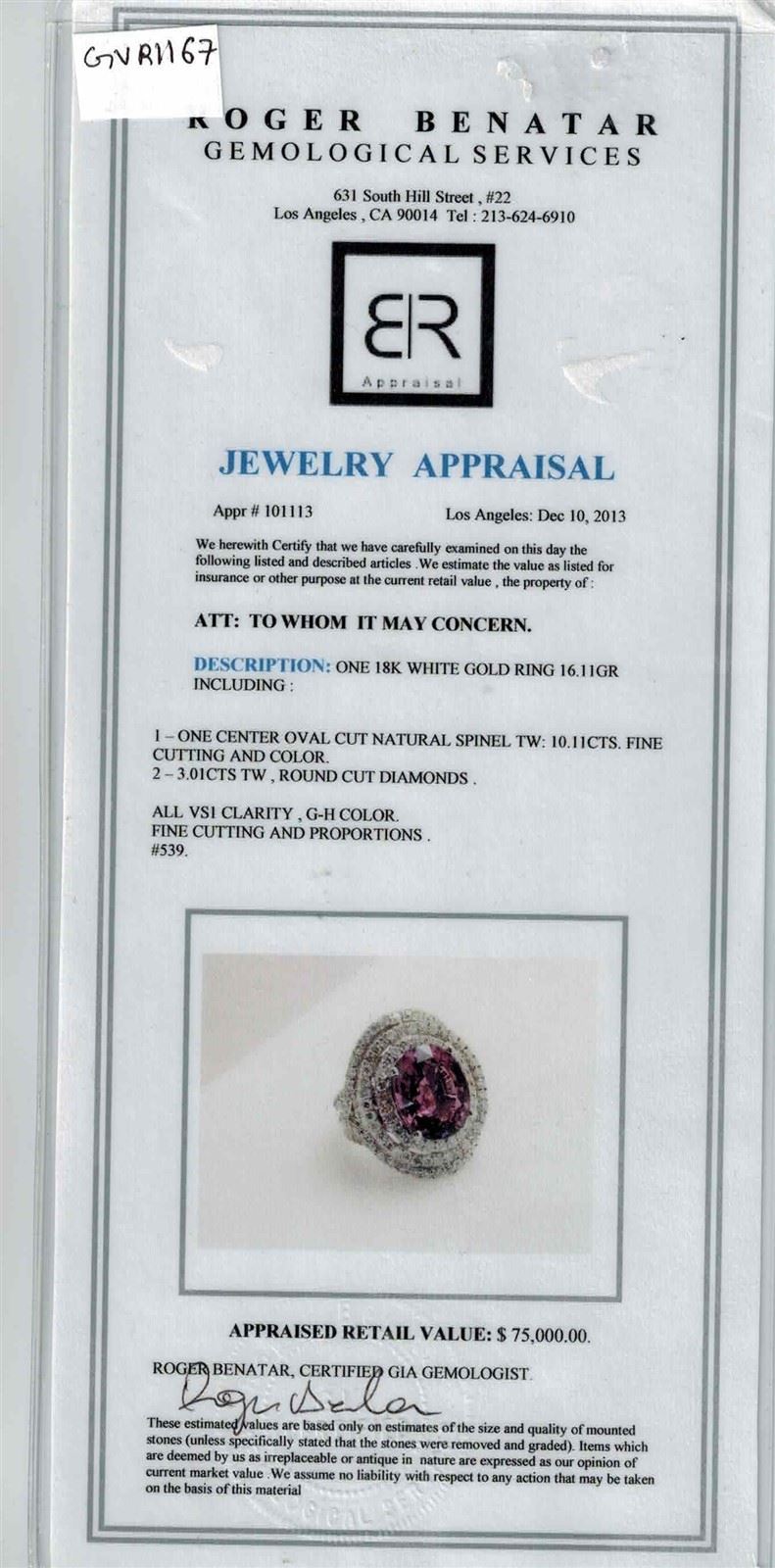 18K WHITE GOLD NATURAL BURMA SPINAL RING:16.11GRAMS/DIAMOND:3.01CT/SPINAL:10.11CT/#GVR1167 **Brilliantly cast in 18K white gold, this glorious 10.11ct Oval Cut Natural Spinel, known for bringing revitalization, inspiration and victory, esctatically hums in an octave reserved for supernovas, burst across the universe. Surrounded by dual twinkling halos of 3.01ct round cut Diamonds, this ring transcends all time, space and reason.**