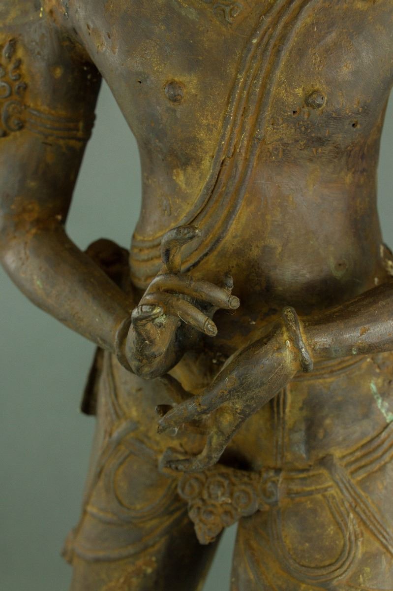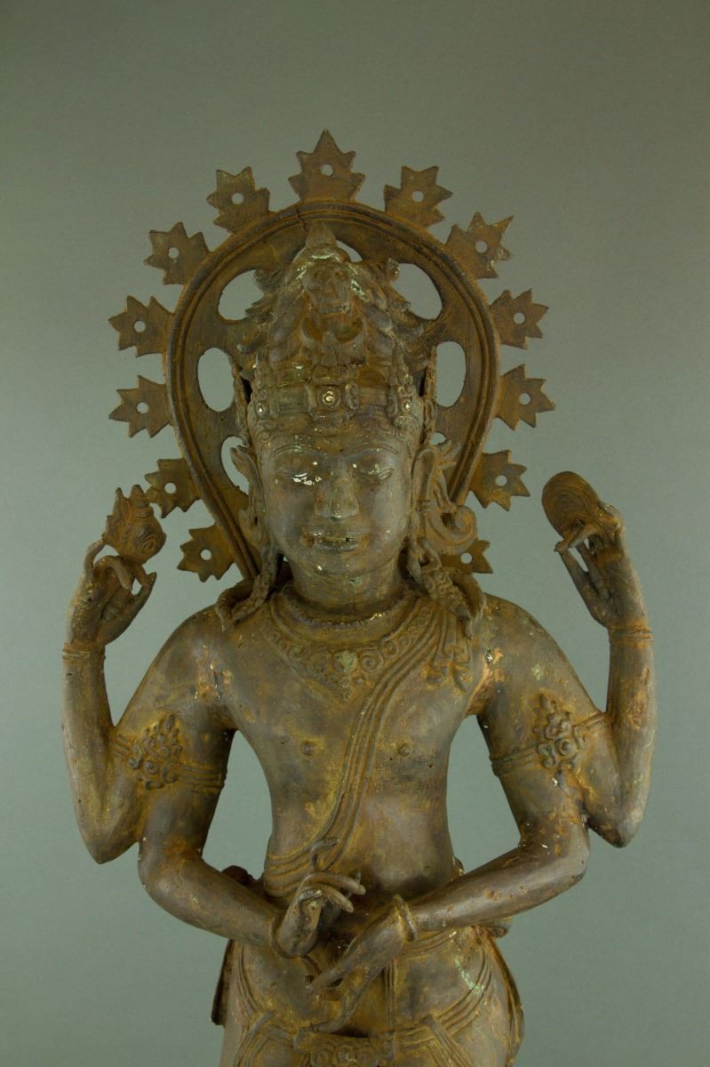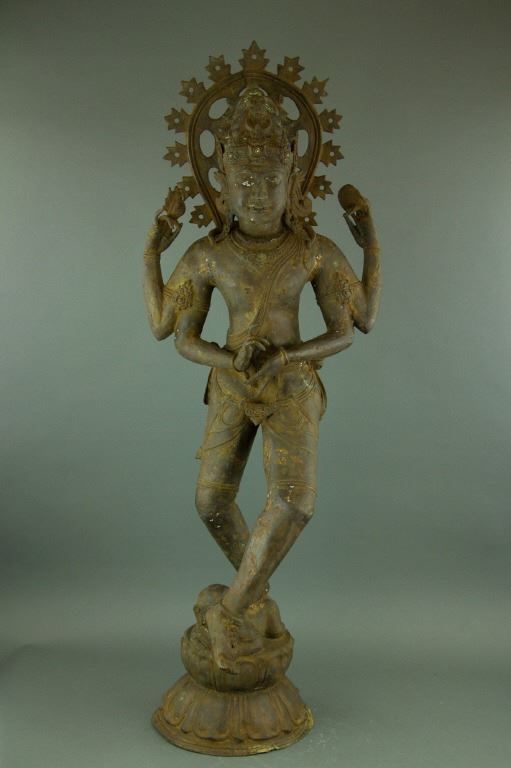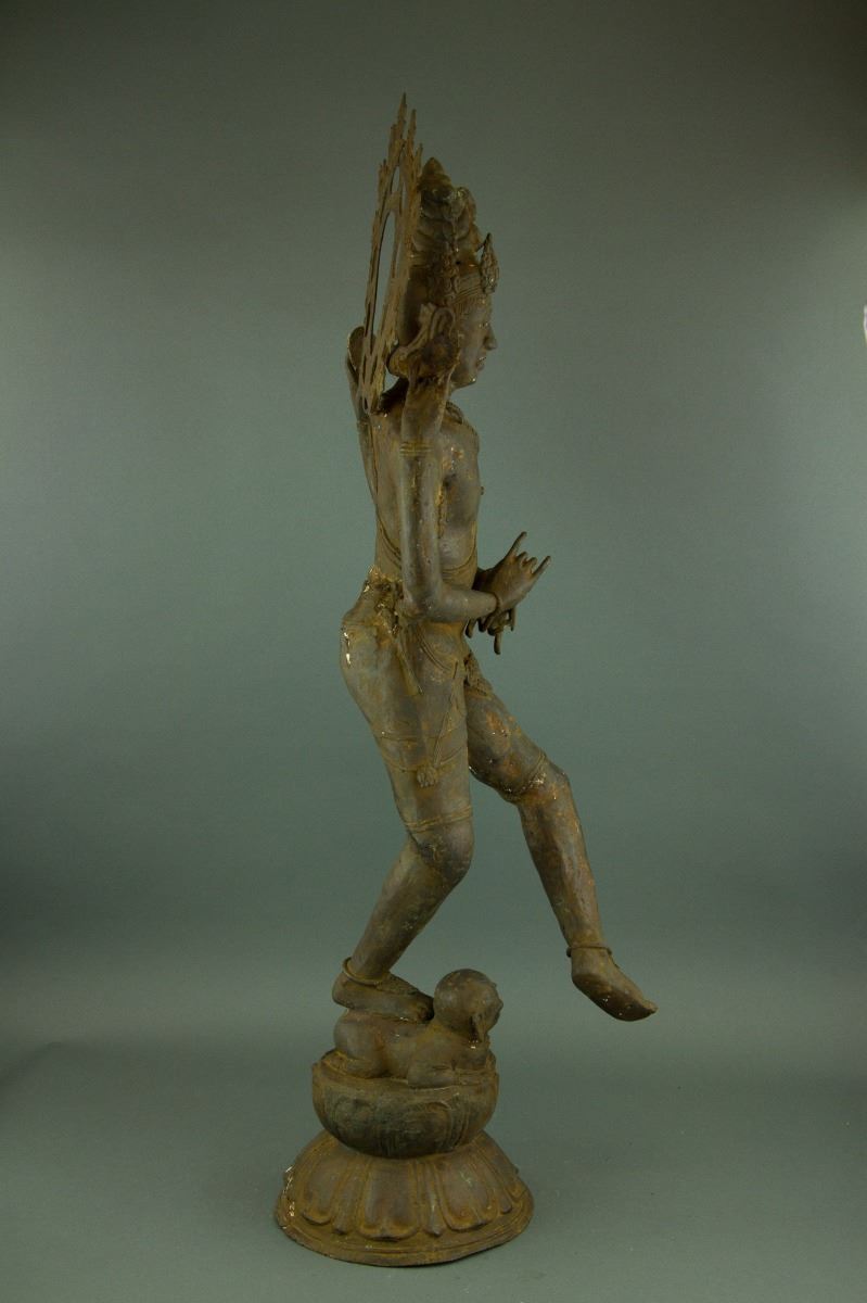 10th to 12th century bronze Hindu deity figure; depicting dancing four-armed Shiva stepped on Apasmara on a double lotus pedestal base; H: 92 cm, W: 33 cm, L: 33 cm, 8 kilograms