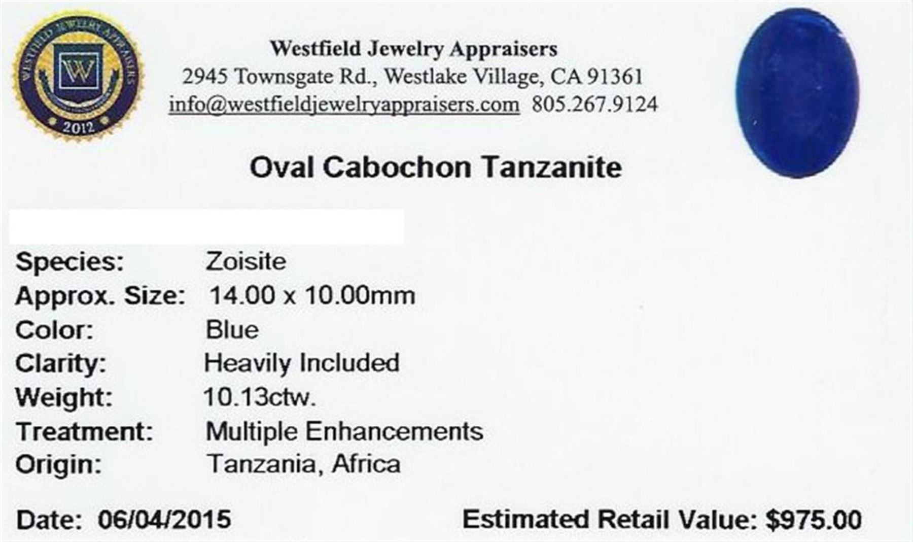 One oval cabochon cut natural tanzanite, measuring 14.00 x 10.00 x 7.00mm, exact weight 10.13ct., clarity is heavily included, type I, dark, moderately strong, blue color, (GIA B 7/4), cut is good. Transmitting light somewhat diffusely, transparent to translucent. Naturally occurring internal & external characteristics are present. Indications of heat treatment. Westfield Appraised.