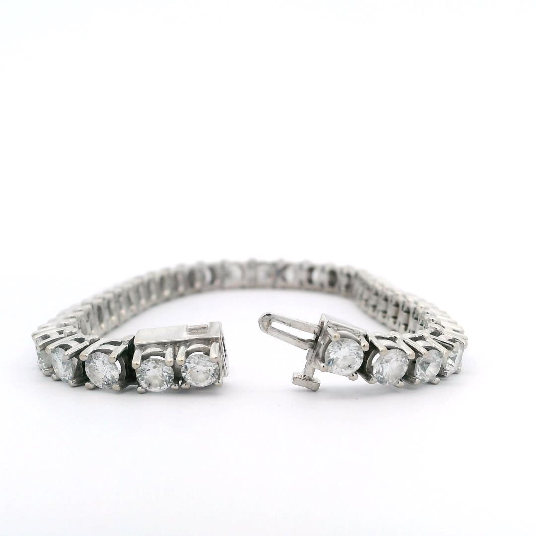 Perfect for adding a touch of everyday elegance, this 14KT white gold tennis bracelet is an exquisite choice. Designed with a basket motif, tongue clasp, and safety fold, the 7-inch bracelet features 38 prong-set round brilliant diamonds totaling 10.13 carats, graded VS-1 to SI-1 in clarity and H to K in color. It's a refined piece that brings subtle sophistication to any outfit.