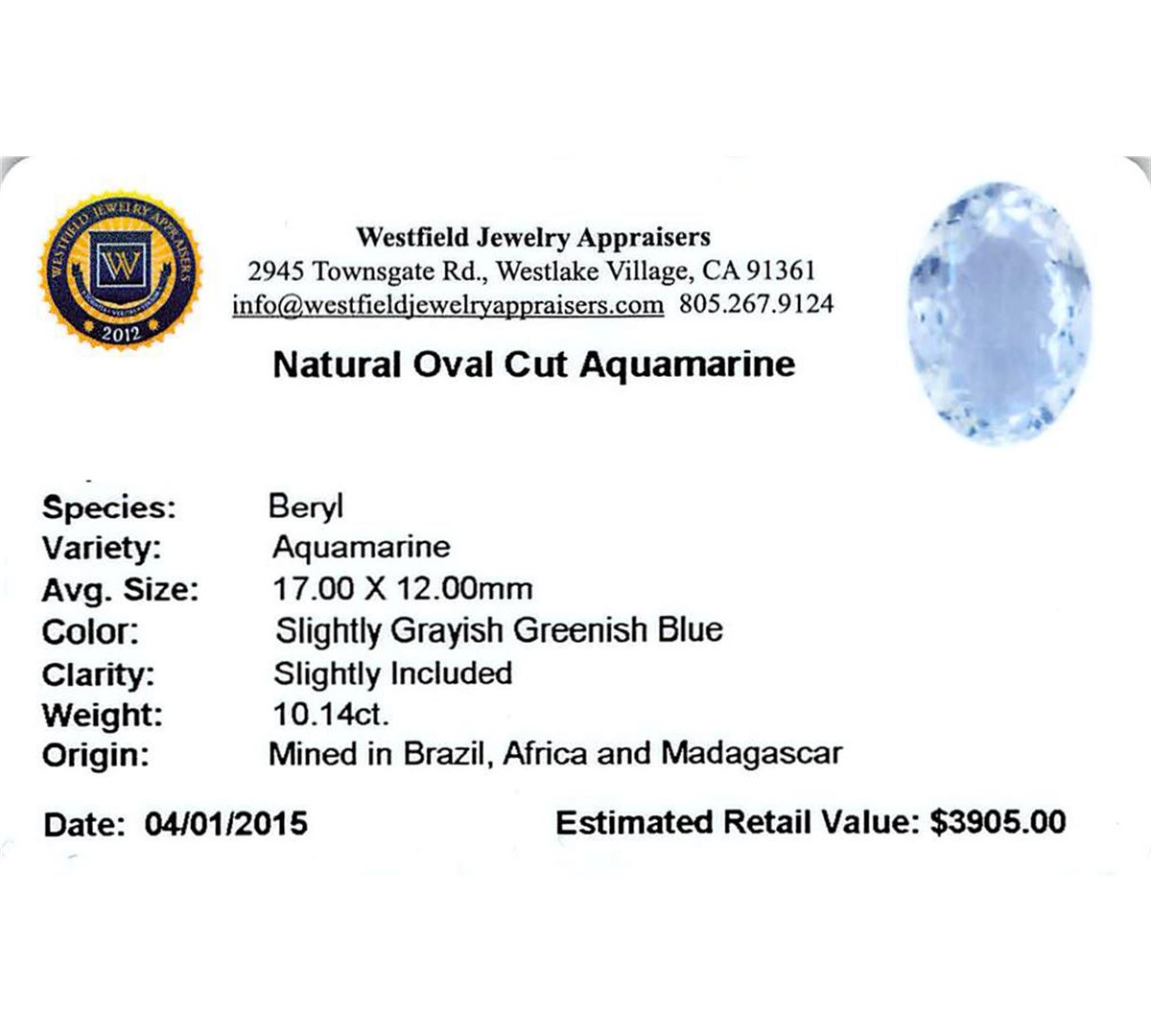 One oval cut natural aquamarine exact weight 10.14ct., clarity is slightly included, type I, medium light, very slightly grayish, very slightly greenish blue color, (GIA vslgB 4/3), cut is good. Westfield Appraised at $3,905.00.