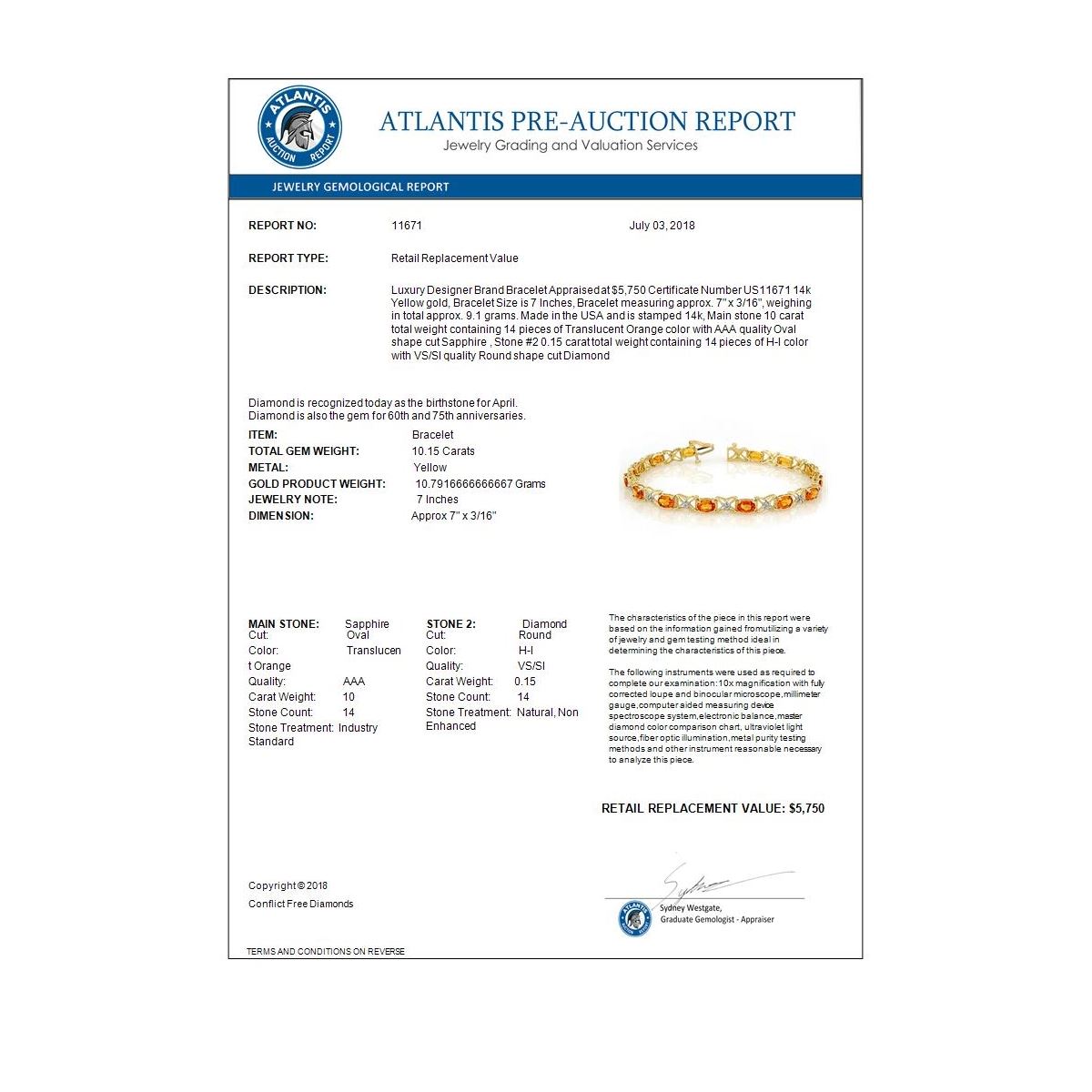 REF-86W9F -11671 ---- 10.15 CTW Orange Sapphire & Diamond Bracelet 14K Yellow Gold ---- Luxury Designer Brand Bracelet Appraised at $5,750 Certificate Number US11671 14k Yellow gold, Bracelet Size is 7 Inches, Bracelet measuring approx. 7" x 3/16", weighing in total approx. 9.1 grams. Made in the USA and is stamped 14k, Main stone 10 carat total weight containing 14 pieces of Translucent Orange color with AAA quality Oval shape cut Sapphire , Stone #2 0.15 carat total weight containing 14 pieces of H-I color with VS/SI quality Round shape cut Diamond