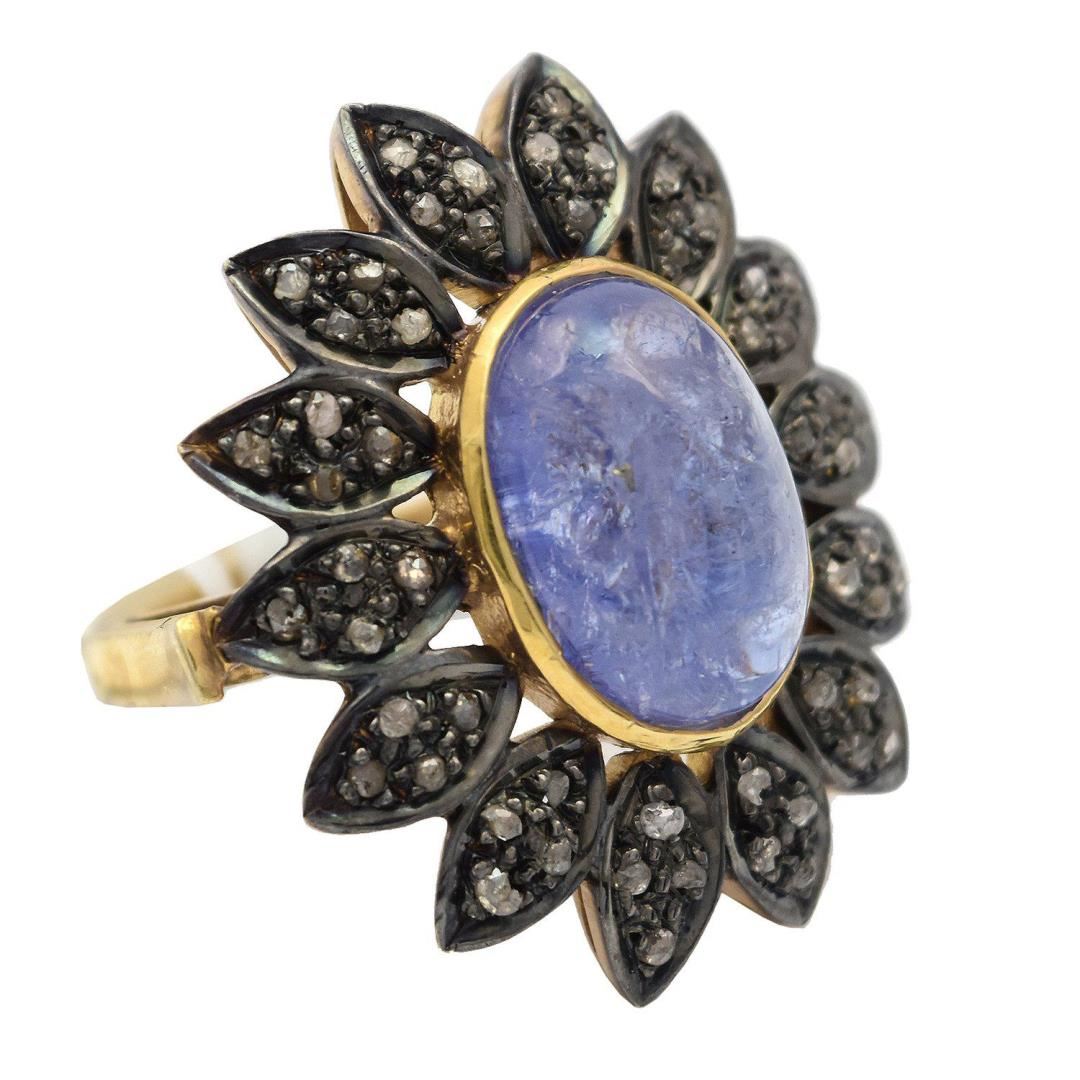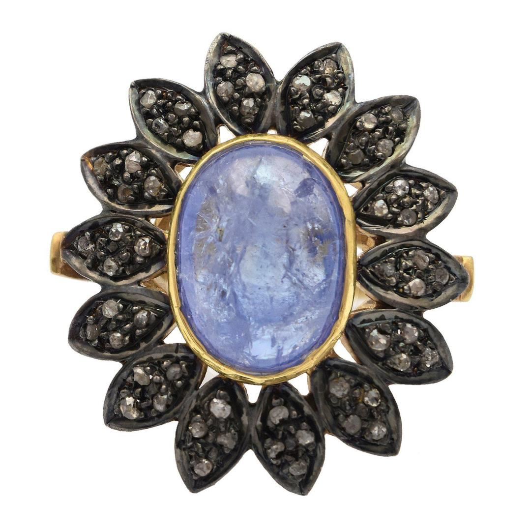 One electronically tested silver and gold ladies custom cast & assembled tanzanite and diamond ring. The featured tanzanite is set within a floret of diamond set petals, completed by a two and one-half millimeter wide band. Bright and anodized finish. Con