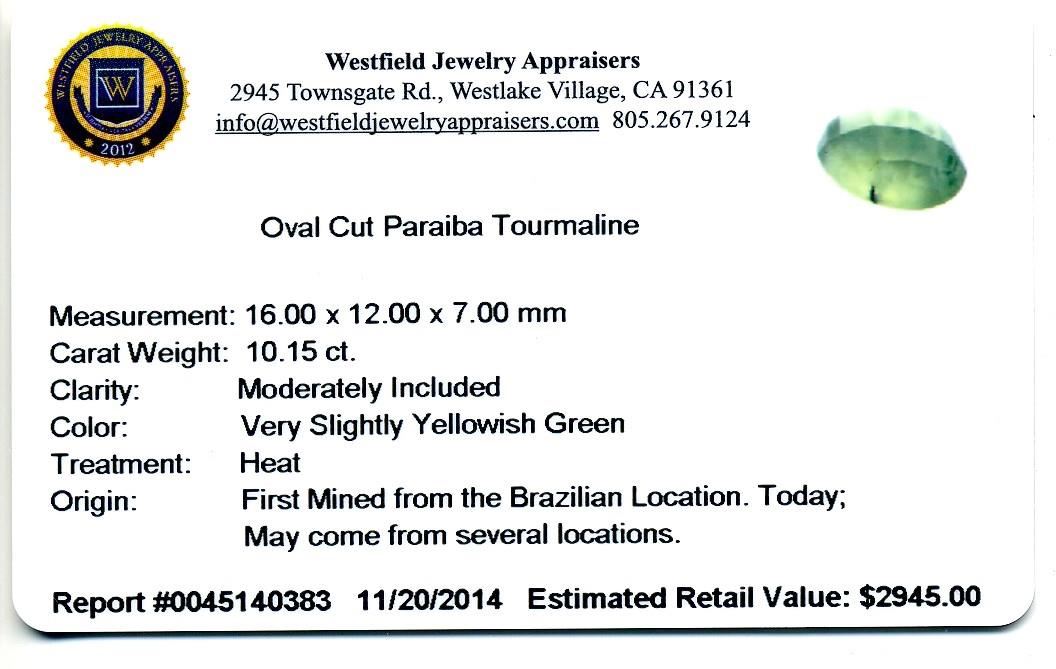 10.15ctw. Oval Cut Paraiba Tourmaline. Westfield Appraised at $2,945.00.