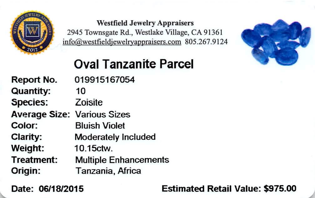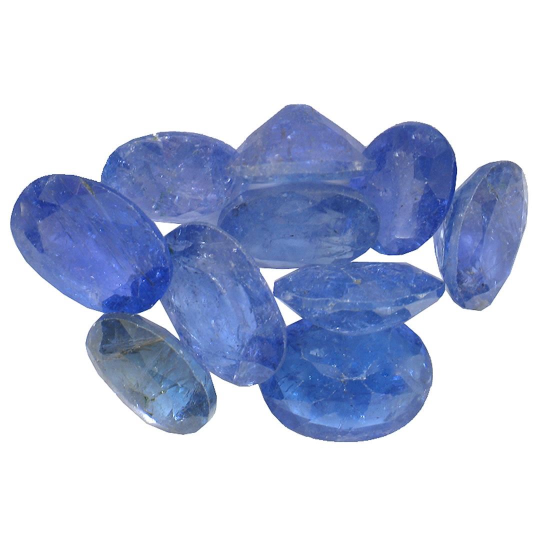 Ten oval mixed cut natural tanzanites exact total weight 10.15ct., clarity is moderately included, type I, medium dark, very slightly grayish, bluish violet color, (GIA bV 6/3), cut is good. Transmitting light with a minimum of distortion, transparent. Westfield Appraised at $975.00.