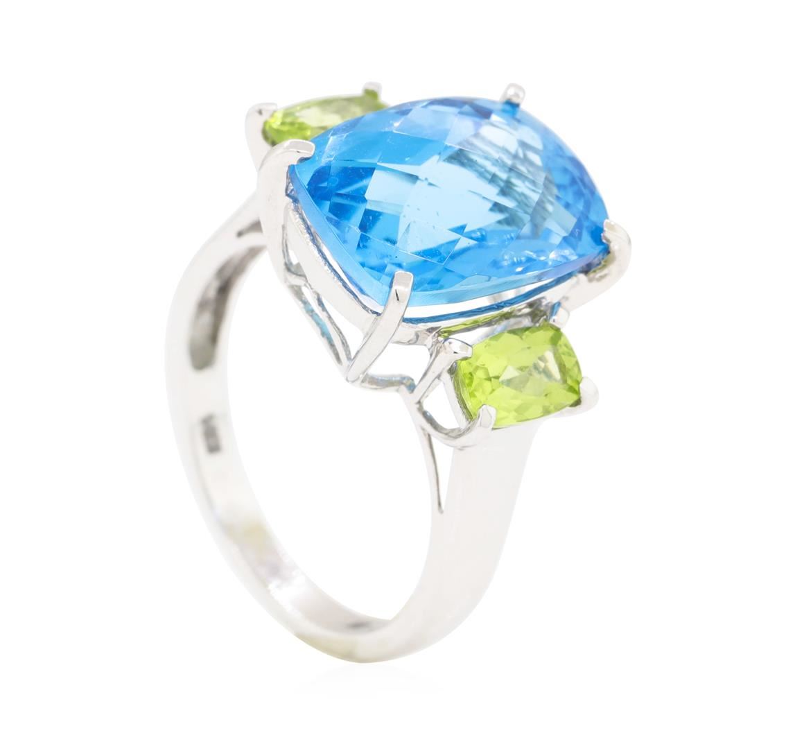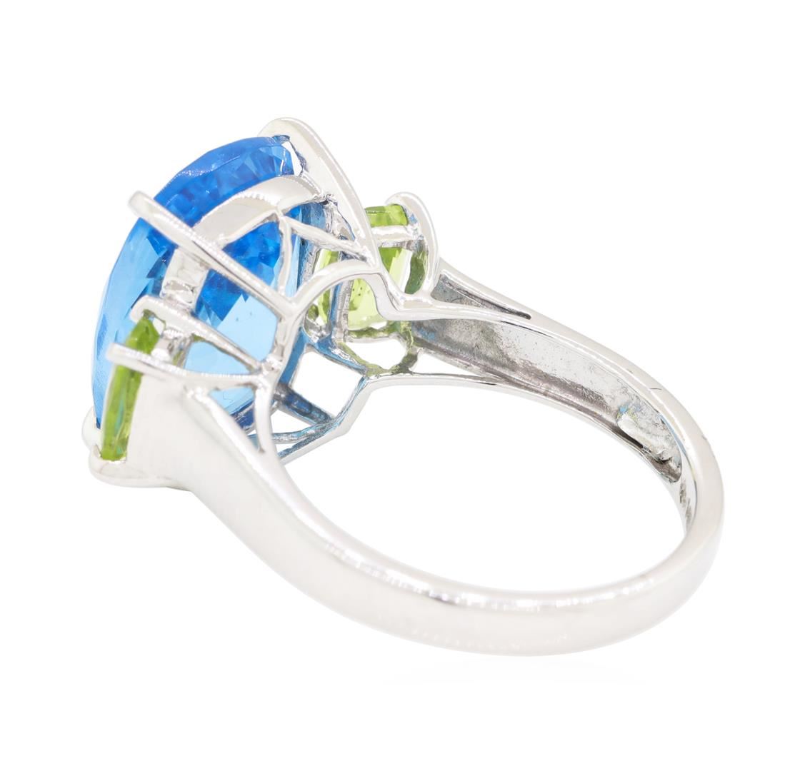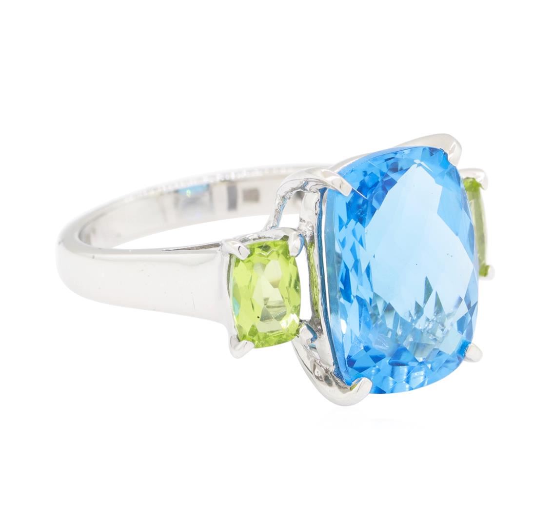 One lady's ring featuring: 14KT white gold weighing 5.3 grams containing blue topaz weighing 9.16ctw and peridot weighing 1.00ctw.