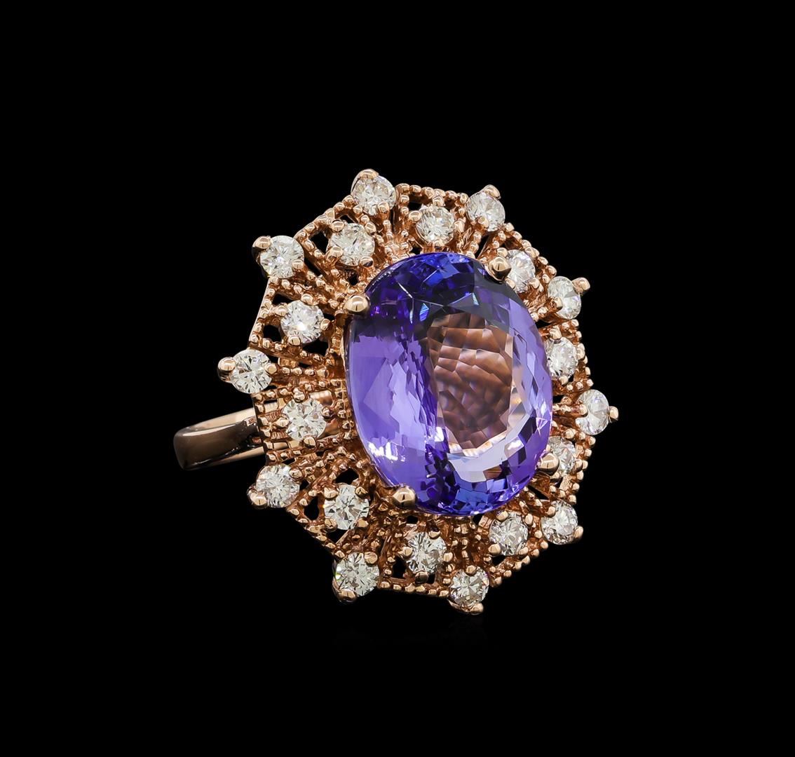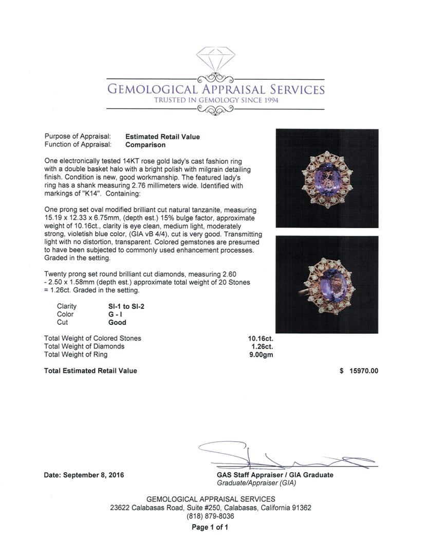 One electronically tested 14KT rose gold lady's cast fashion ring with a double basket halo with a bright polish with milgrain detailing finish. The featured lady's ring has a shank measuring 2.76 millimeters wide. Identified with markings of 'K14'. Condition is new, good workmanship. Containing: One prong set oval modified brilliant cut natural tanzanite, measuring 15.19 x 12.33 x 6.75mm, (depth est.) 15%. bulge factor, approximate weight of 10.16ct., clarity is eye clean, medium light, moderately strong, violetish blue color, (GIA vB 4/4), cut is very good. Transmitting light with no distortion, transparent. Colored gemstones are presumed to have been subjected to commonly used enhancement processes. Graded in the setting. Twenty prong set round brilliant cut diamonds, measuring 2.60 - 2.50 x 1.58mm (depth est.) approximate total weight of 20 Stones = 1.26ct. Graded in the setting. Clarity SI-1 to SI-2. Color: G - I Cut Good. Total Weight of Colored Stones 10.16ct.. Total Weight of Diamonds 1.26ct.. Total Weight of Ring 9.00gm GAS Appraised at $15,970.00.