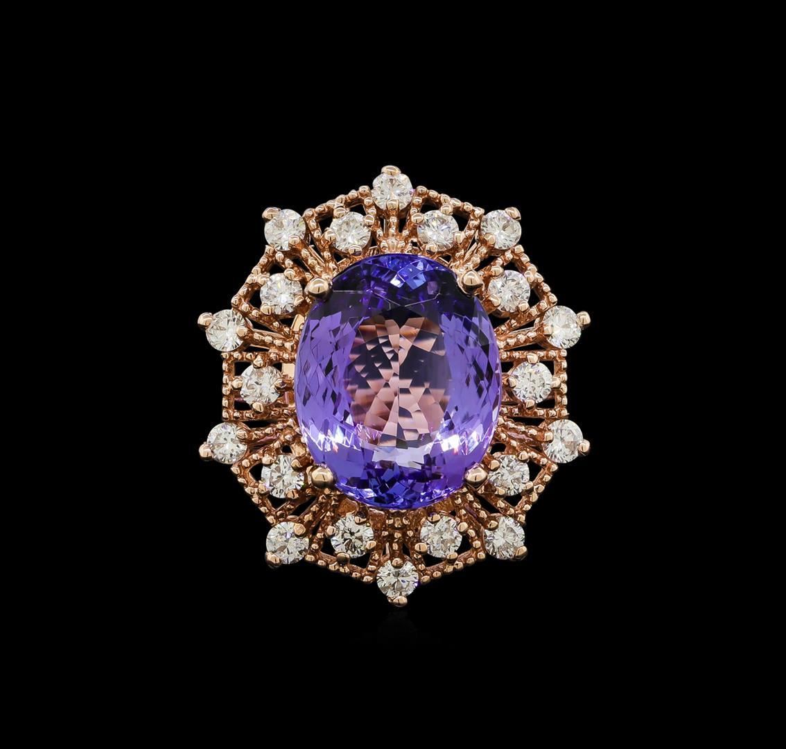 One electronically tested 14KT rose gold lady's cast fashion ring with a double basket halo with a bright polish with milgrain detailing finish. The featured lady's ring has a shank measuring 2.76 millimeters wide. Identified with markings of 'K14'. Condition is new, good workmanship. Containing: One prong set oval modified brilliant cut natural tanzanite, measuring 15.19 x 12.33 x 6.75mm, (depth est.) 15%. bulge factor, approximate weight of 10.16ct., clarity is eye clean, medium light, moderately strong, violetish blue color, (GIA vB 4/4), cut is very good. Transmitting light with no distortion, transparent. Colored gemstones are presumed to have been subjected to commonly used enhancement processes. Graded in the setting. Twenty prong set round brilliant cut diamonds, measuring 2.60 - 2.50 x 1.58mm (depth est.) approximate total weight of 20 Stones = 1.26ct. Graded in the setting. Clarity SI-1 to SI-2. Color: G - I Cut Good. Total Weight of Colored Stones 10.16ct.. Total Weight of Diamonds 1.26ct.. Total Weight of Ring 9.00gm GAS Appraised.