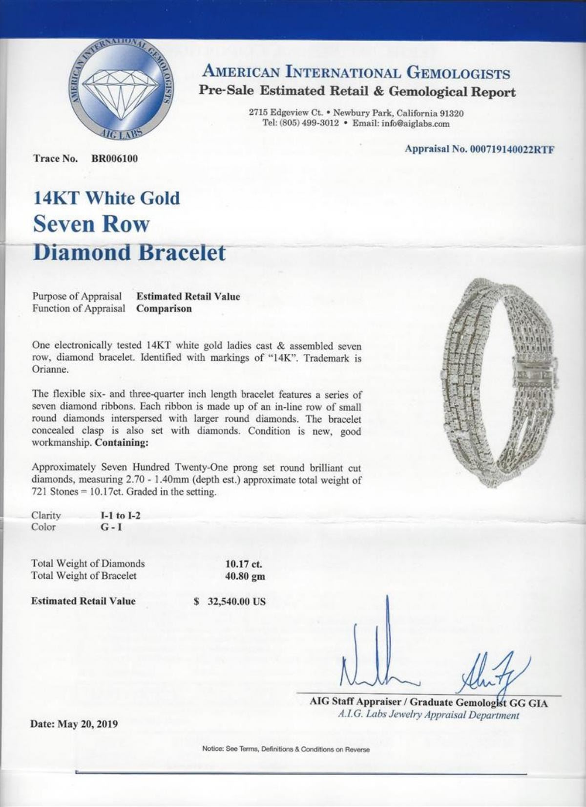 One 10.17ctw Diamond Bracelet - 14KT White Gold . AIG certified. See Appraisal for more details. AIG Appraised.