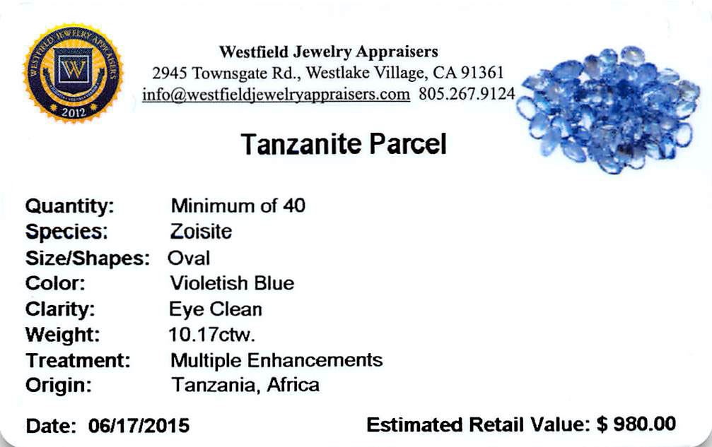 Forty oval mixed cut natural tanzanites exact total weight 10.17ct., clarity is slightly included, type I, medium, very slightly grayish, violetish blue color, (GIA vB 5/3), cut is good. Measurements & the color grade are an average for the group, Color grade is an average for the group, Transmitting light with no distortion, transparent, Indications of laboratory high temperature heat treatment. Westfield Appraised at $980.00.
