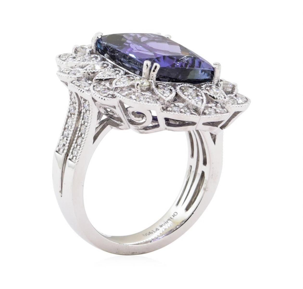 One electronically tested platinum ladies cast & assembled tanzanite & diamond ring. The ring features a tanzanite set within an elegant diamond frame, supported by an elaborate lattice under gallery and diamond set split shoulders, completed by a four millimeter wide band. Bright polish finish with milgrain detailing. Trademark is Orianne. Identified with markings of "PT950". Condition is new, good workmanship. Containing: One prong set cushion modified brilliant cut natural tanzanite, measuring 14.49 x 10.88 x 6.89mm, exact weight 10.17ct., type I Clarity is eye clean, medium dark, very slightly grayish, violet-blue color, (GIA VB 6/3), cut is good. Transmitting light with no distortion, transparent. GIA Gemological Report attached. Graded loose prior to setting in the GIA Laboratory, Report #5171870499.Tanzanite is a very rare gemstone that is only found in the country of Tanzania. Originally discovered in 1967. Tiffany & Company, named the stone Tanzanite. It is found in the Usumburu Mountains that border the Umba Valley of northern Tanzania. Tanzanite occurs in gray, brown, violet, blue, reddish-purple, & green. The gem is interesting because of its exceptional pleochroism. Rotated in different directions a tanzanite will exhibit multiple changes of color. Tanzanite has a low tolerance to ultrasonic cleaning, and should not be cleaned using this method. Seventy-Six prong set round brilliant cut diamonds exact total weight 76 Stones = 1.07ct. Graded in the setting. Clarity VS-2 to SI-2 Color F - H Total Weight of Colored Stones 10.17 ct. Total Weight of Diamonds 1.07 ct. Total Weight of Ring 18.20 gm Estimated Retail Value $ 32,191.00 US