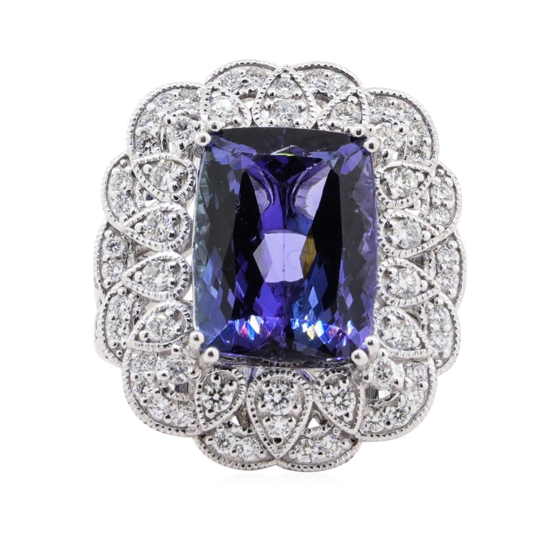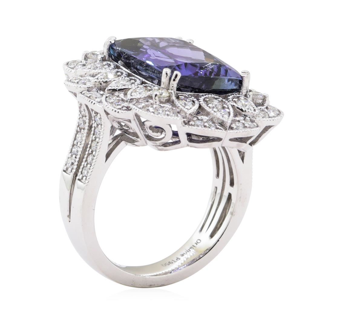 One electronically tested platinum ladies cast & assembled tanzanite & diamond ring. The ring features a tanzanite set within an elegant diamond frame, supported by an elaborate lattice under gallery and diamond set split shoulders, completed by a four millimeter wide band. Bright polish finish with milgrain detailing. Trademark is Orianne. Identified with markings of "PT950". Condition is new, good workmanship. Containing: One prong set cushion modified brilliant cut natural tanzanite, measuring 14.49 x 10.88 x 6.89mm, exact weight 10.17ct., type I Clarity is eye clean, medium dark, very slightly grayish, violet-blue color, (GIA VB 6/3), cut is good. Transmitting light with no distortion, transparent. GIA Gemological Report attached. Graded loose prior to setting in the GIA Laboratory, Report #5171870499.Tanzanite is a very rare gemstone that is only found in the country of Tanzania. Originally discovered in 1967. Tiffany & Company, named the stone Tanzanite. It is found in the Usumburu Mountains that border the Umba Valley of northern Tanzania. Tanzanite occurs in gray, brown, violet, blue, reddish-purple, & green. The gem is interesting because of its exceptional pleochroism. Rotated in different directions a tanzanite will exhibit multiple changes of color. Tanzanite has a low tolerance to ultrasonic cleaning, and should not be cleaned using this method. Seventy-Six prong set round brilliant cut diamonds exact total weight 76 Stones = 1.07ct. Graded in the setting. Clarity VS-2 to SI-2 Color F - H Total Weight of Colored Stones 10.17 ct. Total Weight of Diamonds 1.07 ct. Total Weight of Ring 18.20 gm Estimated Retail Value $ 32,191.00 US